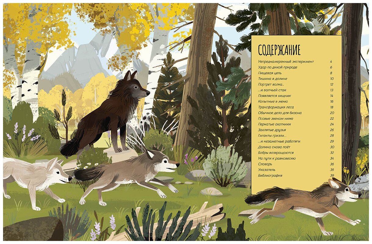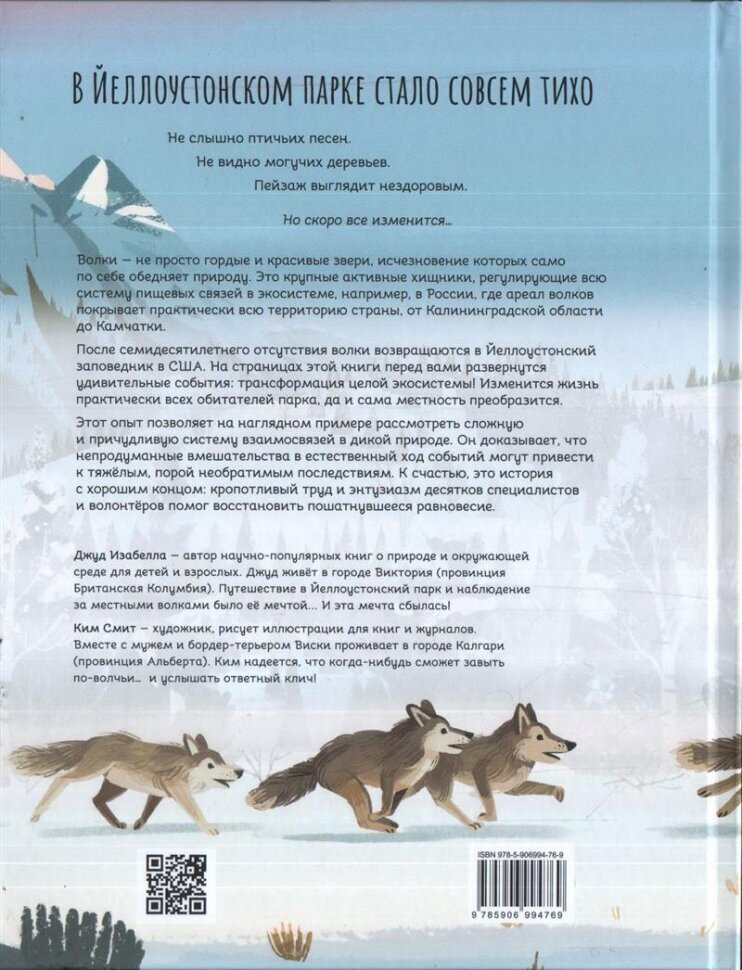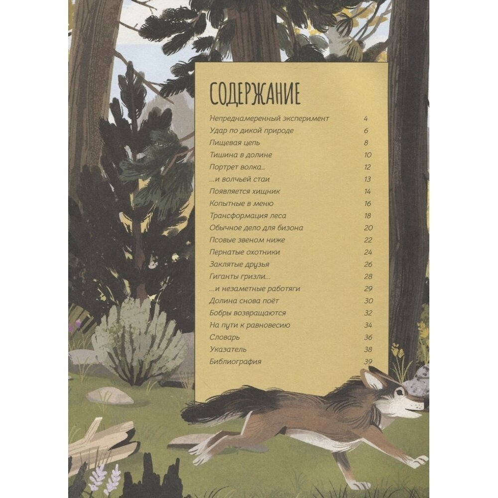 Увлекательная книга с качественными красивыми иллюстрациями и интересной информацией. Например,подробное поэтапное описание пищевой цепочки,в которой участвуют волки и к каким проблемам может привести их(волков) отсутствие в природе. Кроме того у издания хороший перевод.