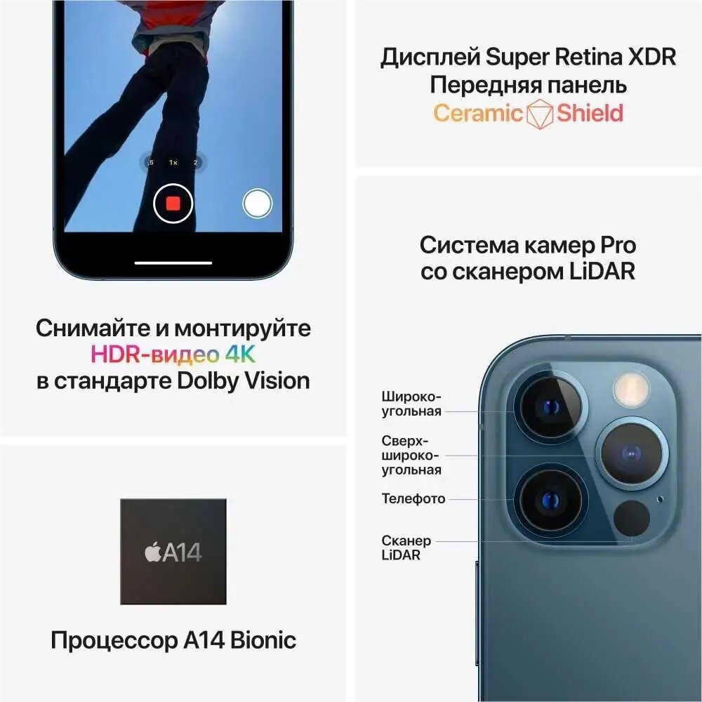 - Система камер Pro 12 Мп: сверхширокоугольная, широкоугольная и телефото; диапазон оптического зума 4x; Ночной режим, технология Deep Fusion, режим Smart HDR 3, фото в формате Apple ProRAW , съёмка HDR‑видео 4K в стандарте Dolby Vision