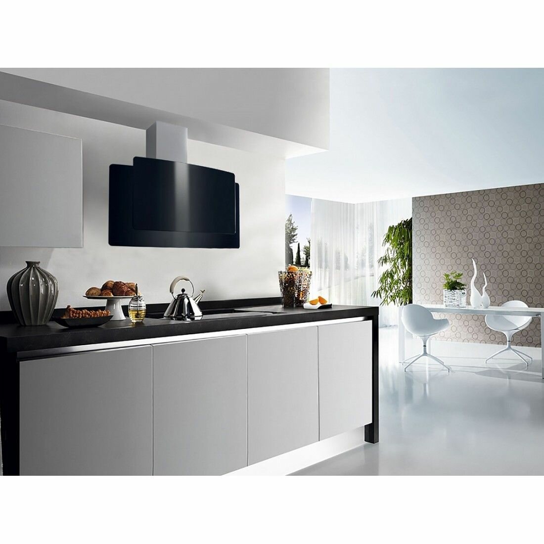 Стильная кухонная вытяжка своим фасадом из закаленного стекла черного цвета украсит любую современную кухню. Нешумный, но мощный мотор эффективно избавит вашу кухню от ненужных запахов как в режиме рециркуляции, так и в режиме воздухоотведения, не отвлекая вас от общения с близкими. оснащена сенсорным блоком управления.