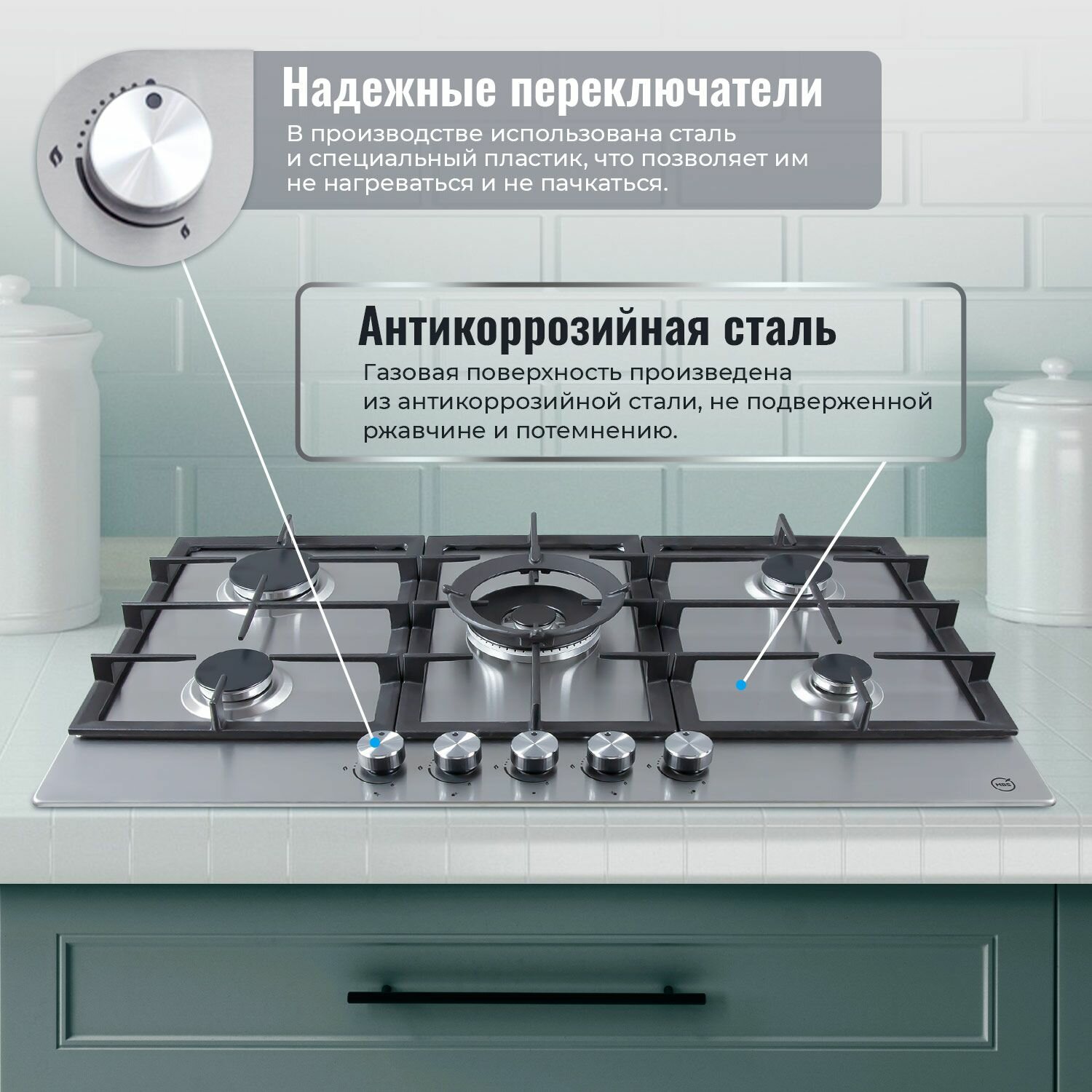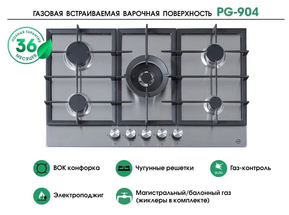 Встраиваемая газовая варочная поверхности станет вашим надежным и удобным кухонным помощником, воплощая ваши кулинарные задумки в жизнь и экономя ваше время и силы. Ширина этой модели и пять конфорок позволят вам разместить на ее поверхности несколько больших кастрюль и сковород одновременно, а с помощью ВОК-горелки вы сможете готовить гораздо быстрее. Ее дизайн с чугунными решетками и металлическими ручками, которые не расплавятся при соприкосновении с горячей посудой, прекрасно впишется в интерьер любой современной кухни, а подключить поверхность можно как к магистральному, так и к баллонному газу. Газовая варочная поверхность оснащается электроподжигом, держателем для сковороды ВОК и комплектом дополнительных жиклеров (форсунок) для подключения к баллонному газу. При желании вы также можете докупить к этой поверхности подставку для турки и специальный противень для приготовления гриля. За безопасность использования этой поверхности отвечает система газ-контроль. Вся кухонная техника бренда MBS соответствует всем современным европейским стандартам, а гарантия производителя составляет 3 года.