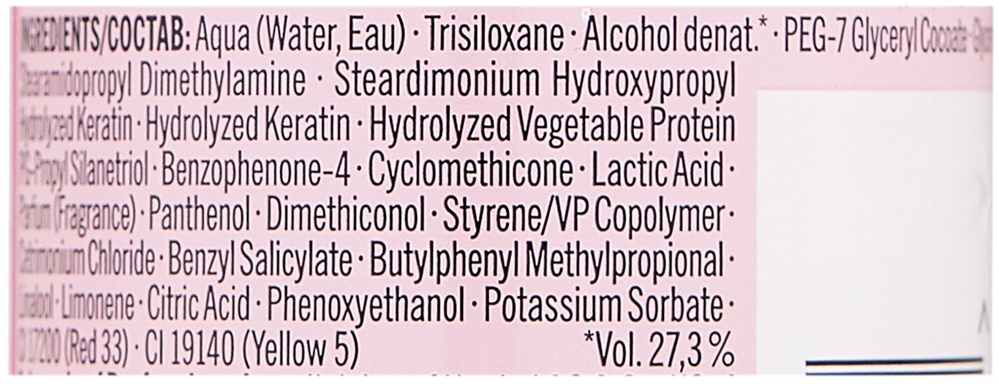 Aqua, Trisiloxane, Alcohol denat., PEG-7, Glyceryl Cocoate, Glycerin, Stearamidopropyl Dimethylamine, Steardimonium Hydroxypropyl Hydrolyzed Keratin, Hydrolyzed Keratin, Hydrolyzed Vegetable Protein, PG-Propyl Silanetriol, Benzophenone-4, Cyclomethicone, Lactic Acid, Parfum, Panthenol, Dimethiconol, Styrene/VP Copolymer, Cetrimonium Chloride, Benzyl Salicylate, Butylphenyl Methylpropional, Linalool, Limonene, Citric Acid, Phenoxyethanol, Potassium Sorbate.