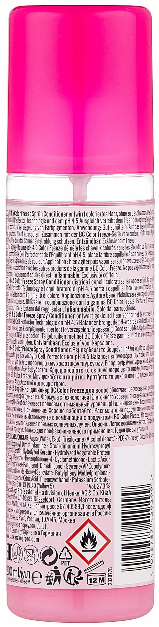 Спрей-кондиционер BC pH 4.5 Color Freeze Spray Conditioner из профессиональной линейки косметического бренда Schwarzkopf Professional предназначен для ухода за окрашенными волосами.