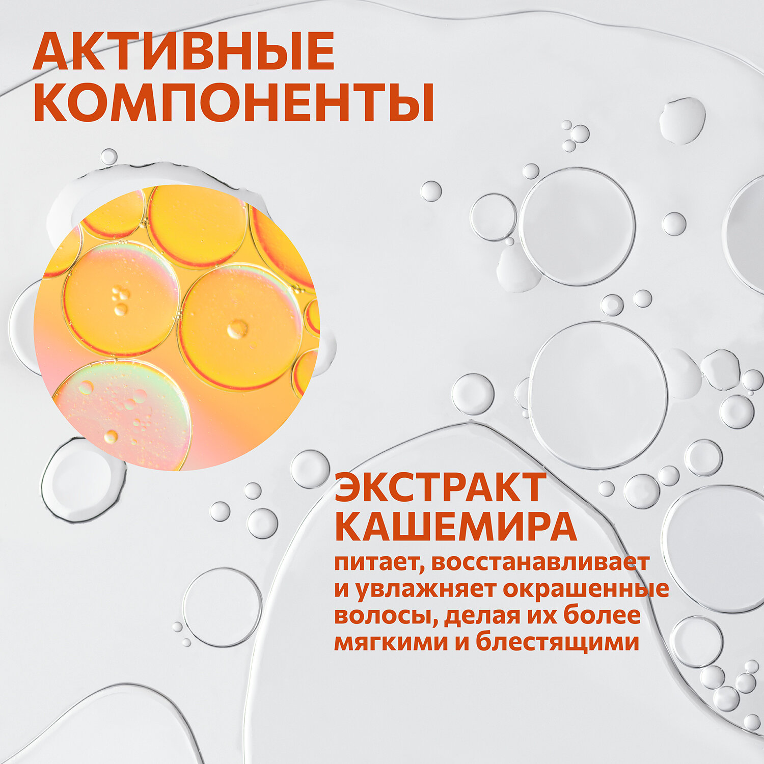 Для защиты цвета окрашенных волос. Деликатно очищает окрашенные и химически обработанные волосы. Экстракт кашемира питает, восстанавливает и увлажняет, делает волосы более мягкими и блестящими. Коктейль из легчайших кондиционирующих веществ обеспечивает локонам защиту от температурного воздействия, делает пряди послушными и аккуратными, предупреждает спутывание, упрощает укладку.