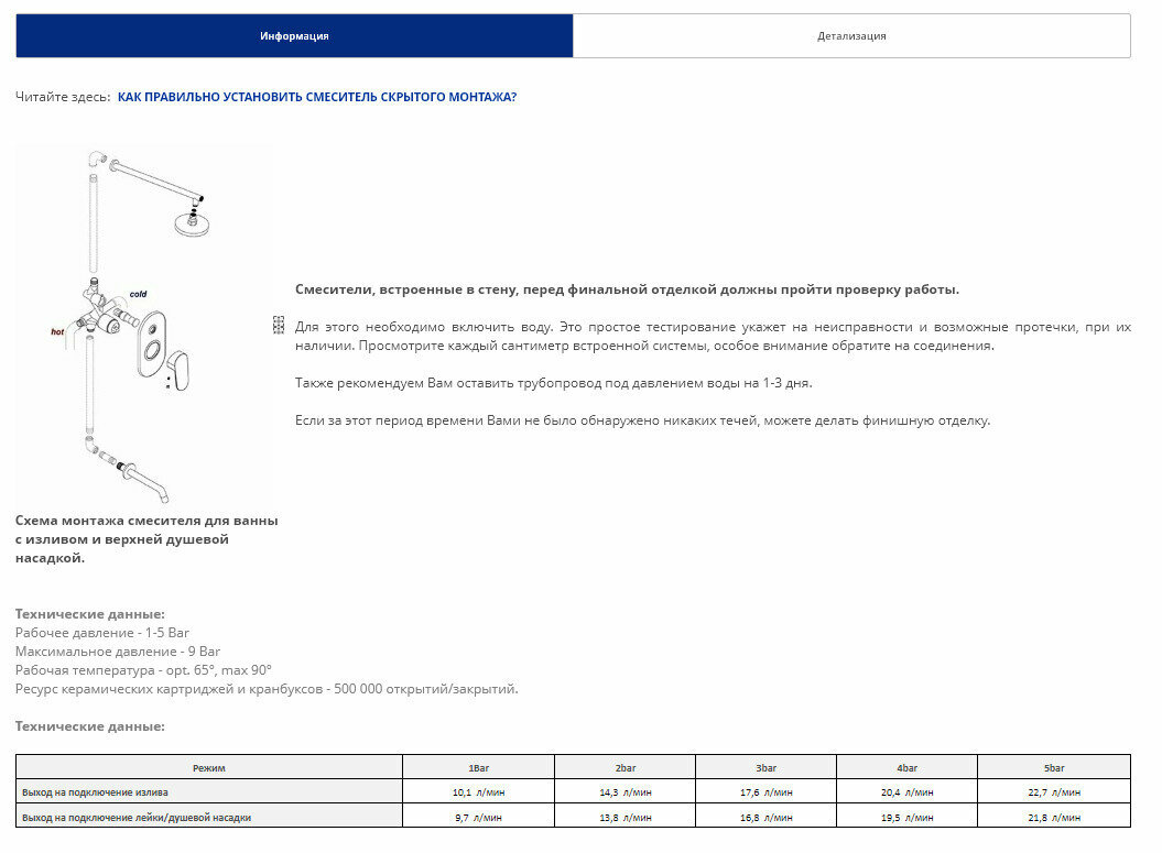 | Комплектация | скрытая часть (встраиваемый механизм), смеситель |