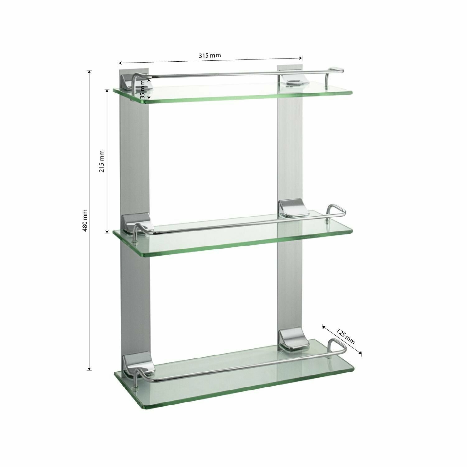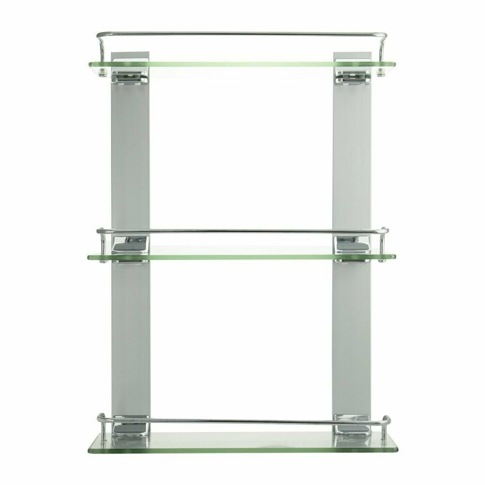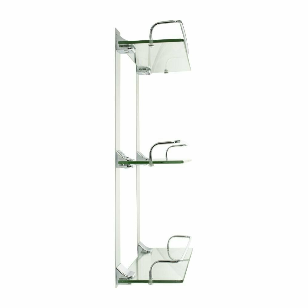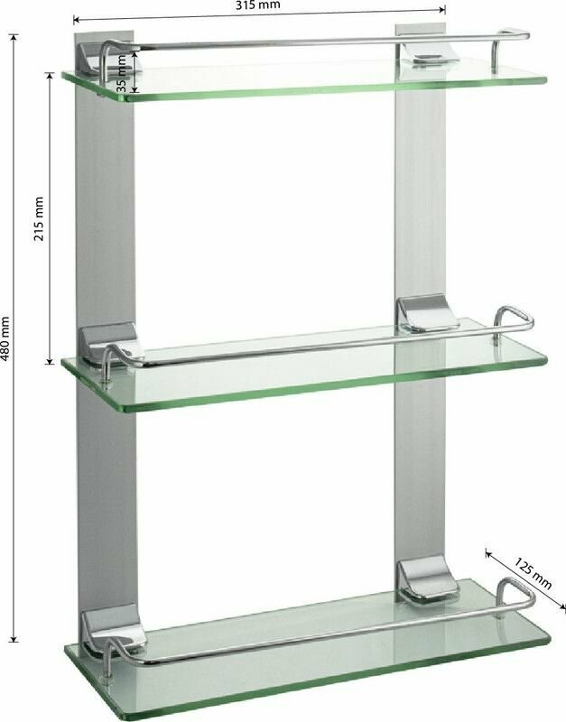 Полка стеклянная, настенная, 3-х этажная. Подвесная трёхэтажная настенная полка для ванной из прочного стекла , толщиной 5 мм с полированными краями о которые невозможно порезаться, с надежной фиксацией к стене с помощью крепления из металла с хромированным покрытием, идеально подходит для хранения различных ванных принадлежностей. Полочка изготовлена из качественного стекла и имеет бортик, предотвращающий падение ванных принадлежностей. Полка для ванной функциональное и практичное решение для любого интерьера. Хромированное покрытие креплений очень стойко переносит истирания и обеспечивает зеркальный блеск изделия. Идеально подойдет не только для ванной, но и для кухни. Изделие крепится к стене с помощью дюбелей и саморезов (входят в комплект). Габаритные размеры: высота 480 мм, ширина 315 мм, глубина 125 мм, расстояние между полками 215 мм. Вес - 2,500 кг.