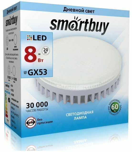 Светодиодная лампа Smartbuy GX53 - энергосберегающая лампа общего или декоративного освещения, подходит для замены стандартных ламп накаливания и галогенных. Благодаря своей экономичности, длительному сроку службы и экологичности светодиодные лампы выгодно отличаются от своих предшественников. Колба лампы выполнена в форме шара. Поверхность колбы матовая. Лампа GX53 повторяет форму и размеры стандартных ламп типа "таблетка" и идеально подходит к любому светильнику, в котором используются данные типы ламп. В светодиодных лампах серии G45 применяются высокоэффективные светодиоды, обеспечивающие эффективность до 80 лм/Вт. При этом коэффициент цветопередачи ламп обеспечивается на уровне Ra>80. Особенности: - Хорошая цветопередача. - Отсутствие мерцания обеспечивает меньшую утомляемость глаз. - Высокоэффективный драйвер обеспечивает стабильную работу. - Устойчивость к механическому воздействию. - Большой срок службы - 30 000 часов работы. - Широкий рабочий температурный режим от -25° до +45°С. - Не содержит ртуть, экологически безопасна. Тип колбы: GX53. Индекс цветопередачи: RA>80. Частота: 50 Гц. Напряжение: 220-240 В. Коэффициент мощности: 0,06.