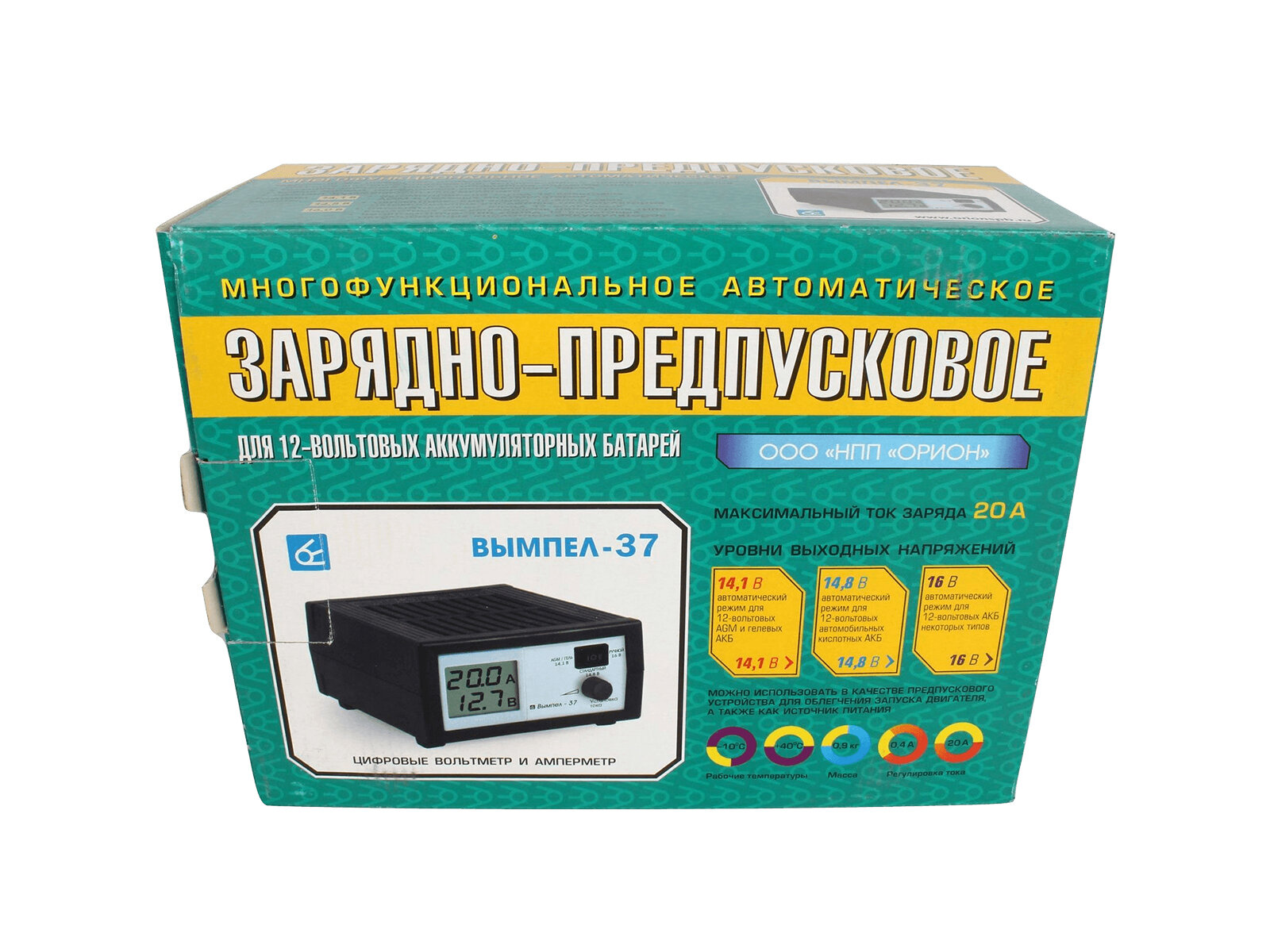 | Прочие особенности и свойства | Зарядно-предпусковое устройство Вымпел 37 2046 - компактное устройство, которое используется для зарядки аккумуляторных батарей любого типа и емкости. Аппарат позволяет заряжать автомобильные, лодочные, а также мотоциклетные батареи. Прибор имеет встроенную защиту от переполюсовки и перегрева. Модель эффективно работает даже с полностью разряженной батареей. Агрегат оснащается цифровым дисплеем, на котором отображаются рабочие параметры. |