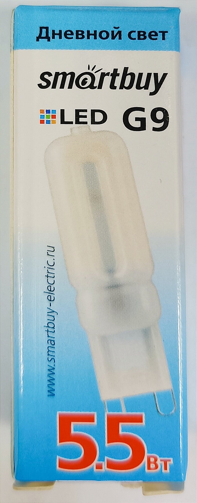 Мощность, Вт: 5,5Световой поток 350 люмен (замена лампы накаливания 50ватт)Цветовая температура, K: 4000 (нейтральный белый)Тип цоколя: G9Тип колбы: капсулаХорошая цветопередача.Отсутствие мерцания обеспечивает меньшую утомляемость глаз.Высокоэффективный драйвер обеспечивает стабильную работу.Устойчива к механическому воздействию.Большой срок службы — 30 000 часов работы.Широкий рабочий температурный режим от -25° до +45°С.Не содержит ртуть, экологически безопасна.Светодиодная лампа Smartbuy G9 — энергосберегающая лампа общего и декоративного освещения, подходит для замены галогенных капсульных ламп. Сочетает в себе компактный размер и особую яркость. Идеально подходит к любому светильнику, в котором используются данные типы ламп.