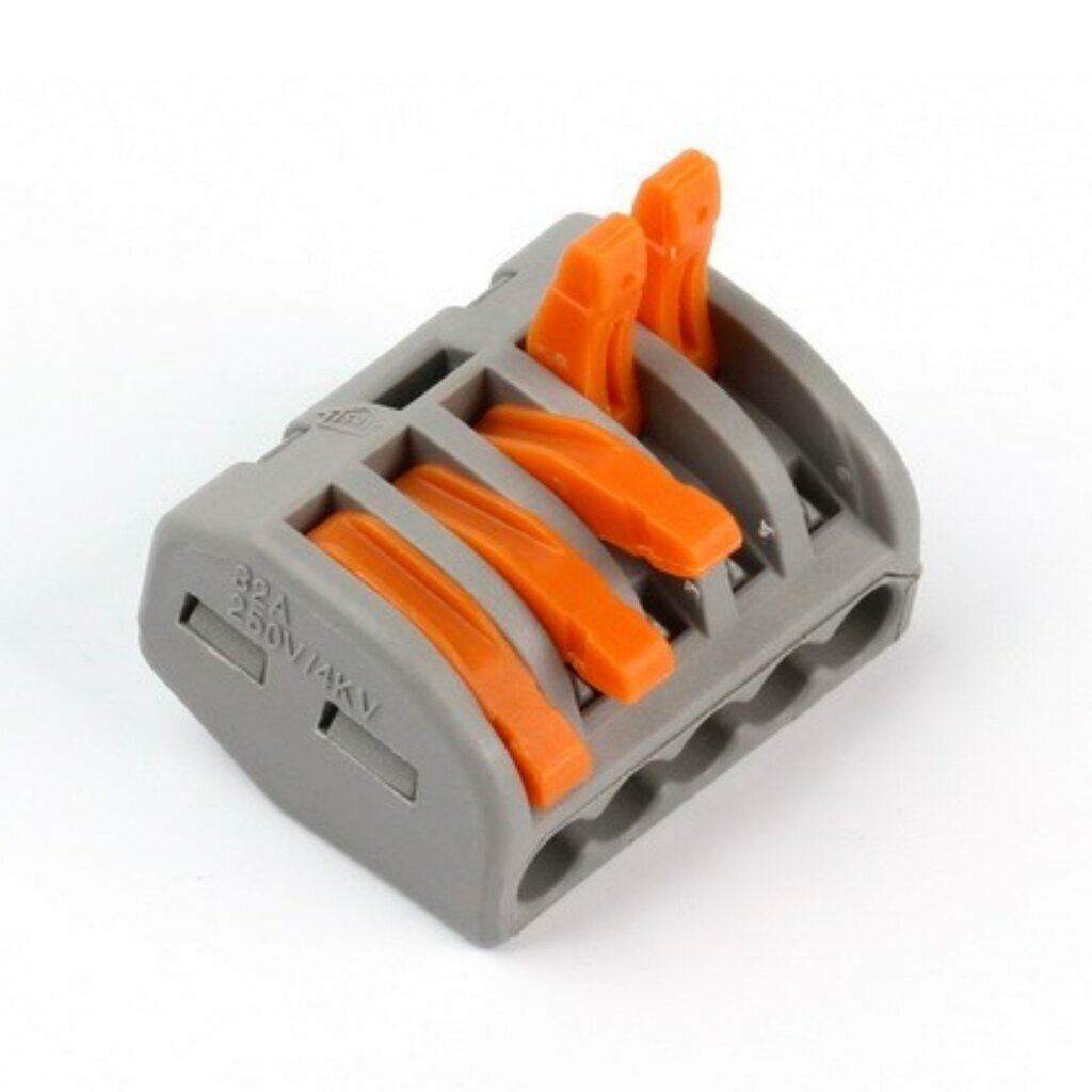 Строительно-монтажная клеммы предназначены для соединения проводников. Пружинные зажимы клемм обеспечивают надежный и долговечный контакт. Наличие технологического отверстия позволяет проверять наличие электрического контакта между проводниками. Последняя цифра в наименовании позволяет определить количество соединяемых проводников. Преимуществом строительно-монтажных клемм перед другими видами электрических соединений является простота монтажа и надежная защита от контакта с токоведущими частями. Номинальное напряжение - 240/415 В. Номинальный ток - 32 А. Количество зажимов (подключаемых проводников) - 5. Максимальное сечение подключаемого провода - 0,8-4,0 мм².