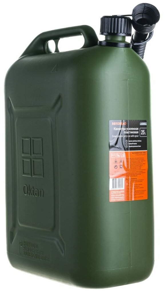 Канистра пластиковая "АвтоДело" Безопасен при заправке горючим 493*350*200мм. 25лБлагодаря усиленной продуманной конструкции и применению высококачественных материалов пластиковые канистры автодело успешно конкурируют с продукцией известных европейских производителей. Размещение же производства на территории России позволяет предложить потребителям значительно более низкие цены.Основными особенностями конструкции канистр стоит выделить следующее:Усиленная конструкция и утолщённые стенки позволяют выдерживать самые высокие нагрузки при экстремальных условиях эксплуатации,Защита пробки от случайного открытия детьми,Комплектация гибким шлангом с функцией антибульк,Углубление на дне канистры для удобства применения.Канистры прошли добровольную сертификацию на основании лабораторных исследований. Имеют пожарный сертификат, подтверждающий возможность применений канистр для хранения и перевозки бензина, а также подтверждающий безопасность контакта канистры с металлическим заправочным пистолетом на бензоколонке.