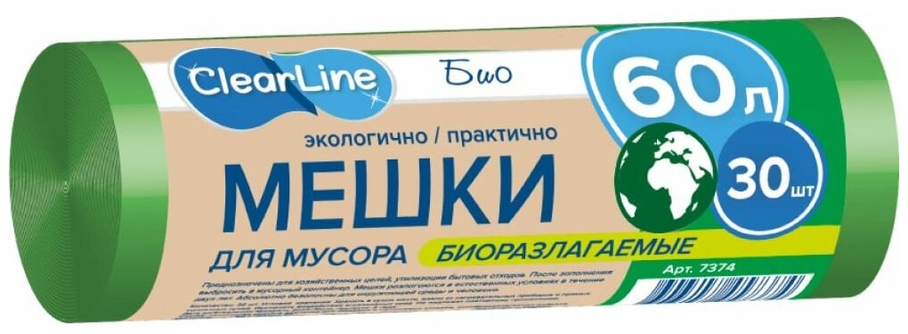 Мешки БИО для мусора ПНД CLEAR LINE 60л зеленые 30шт