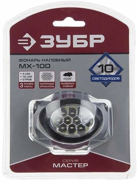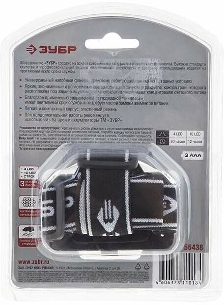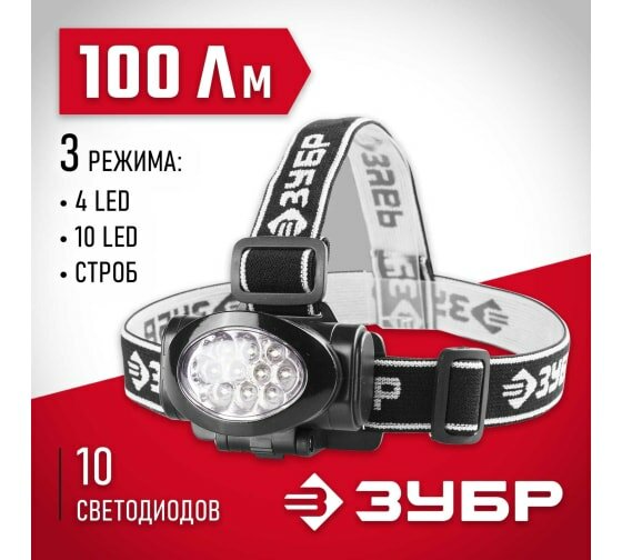 Оборудование ЗУБР изготовлено из высококачественных современных материалов. Профессиональный подход и учет всех тенденций развития рынка обеспечивают высокую надежность и длительный срок службы.Преимущества3 режима: 4 LED, 10 LED, мерцание,Защищен от попадания внутрь пыли, песка и брызг воды,Фиксируемый угол наклона корпуса,Яркие, экономичные и долговечные светодиоды в матричном отражателе, каждая грань которого расположена под заданным углом, что многократно увеличиваетОснащен регулируемым прочным и эластичным ремнем,Время работы: 30 ч (режим 4 LED).Идеально подходит для работы и активного отдыха,ИспользованиеПредназначен для освещения темных участков. Используется для четкого акцентированного освещения в помещениях и на улице