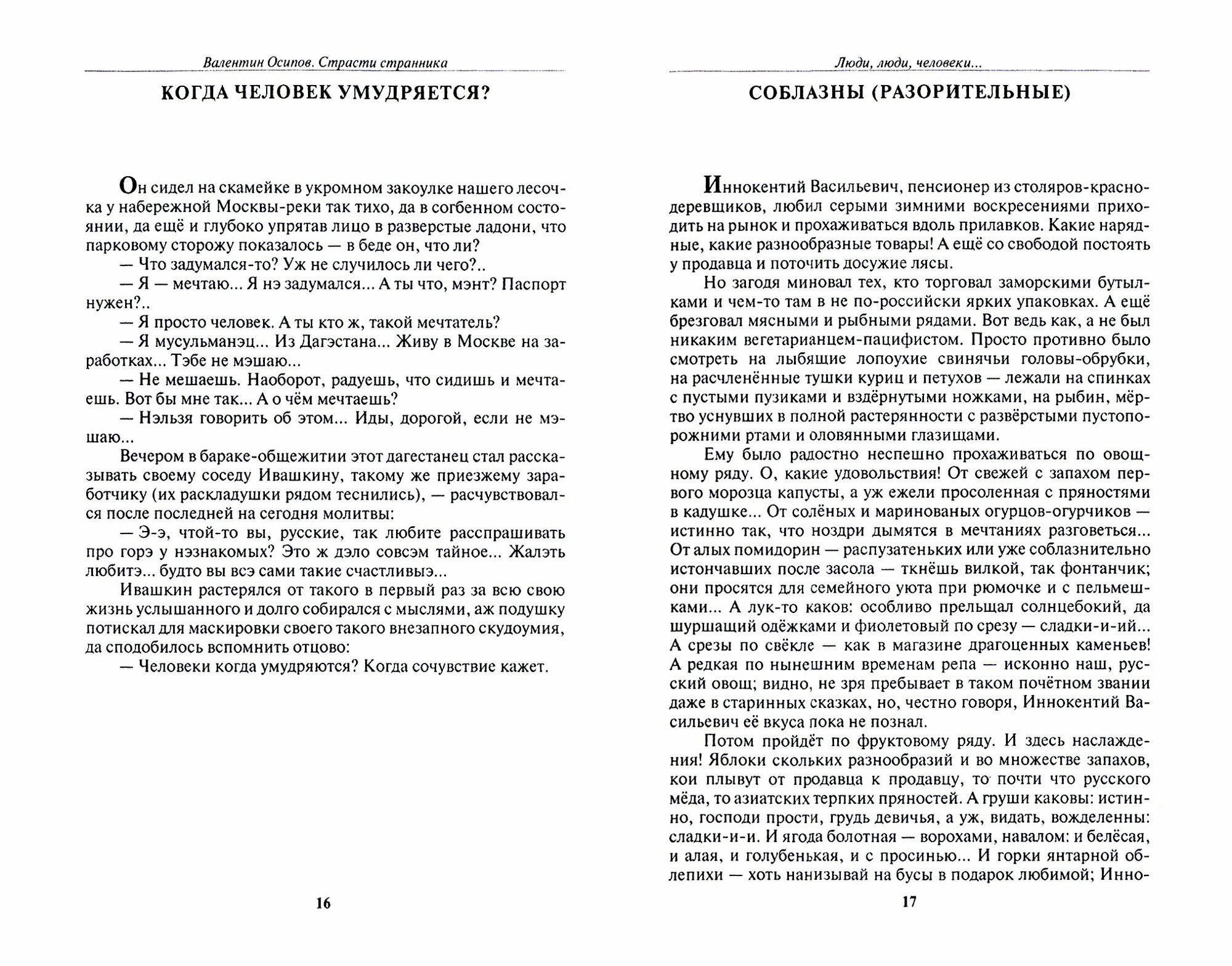 Член Высшего Творческого совета Союза писателей России, лауреат Большой литературной премией России и премии им. Шолохова, автор книг о А. Пушкине, Н. Чернышевском, Л. Толстом, М. Шолохове, панфиловце В. Клочкове, о выдающихся современниках, журналист и издатель Валентин Осипович Осипов определил свою новую книгу как многотемную и многожанровую. Её основу составили рассказы и повести (даже фантастика), необычные мемуары, сказики и юмор, и всё это в попытке познать характеры своих обычных соотечественников.