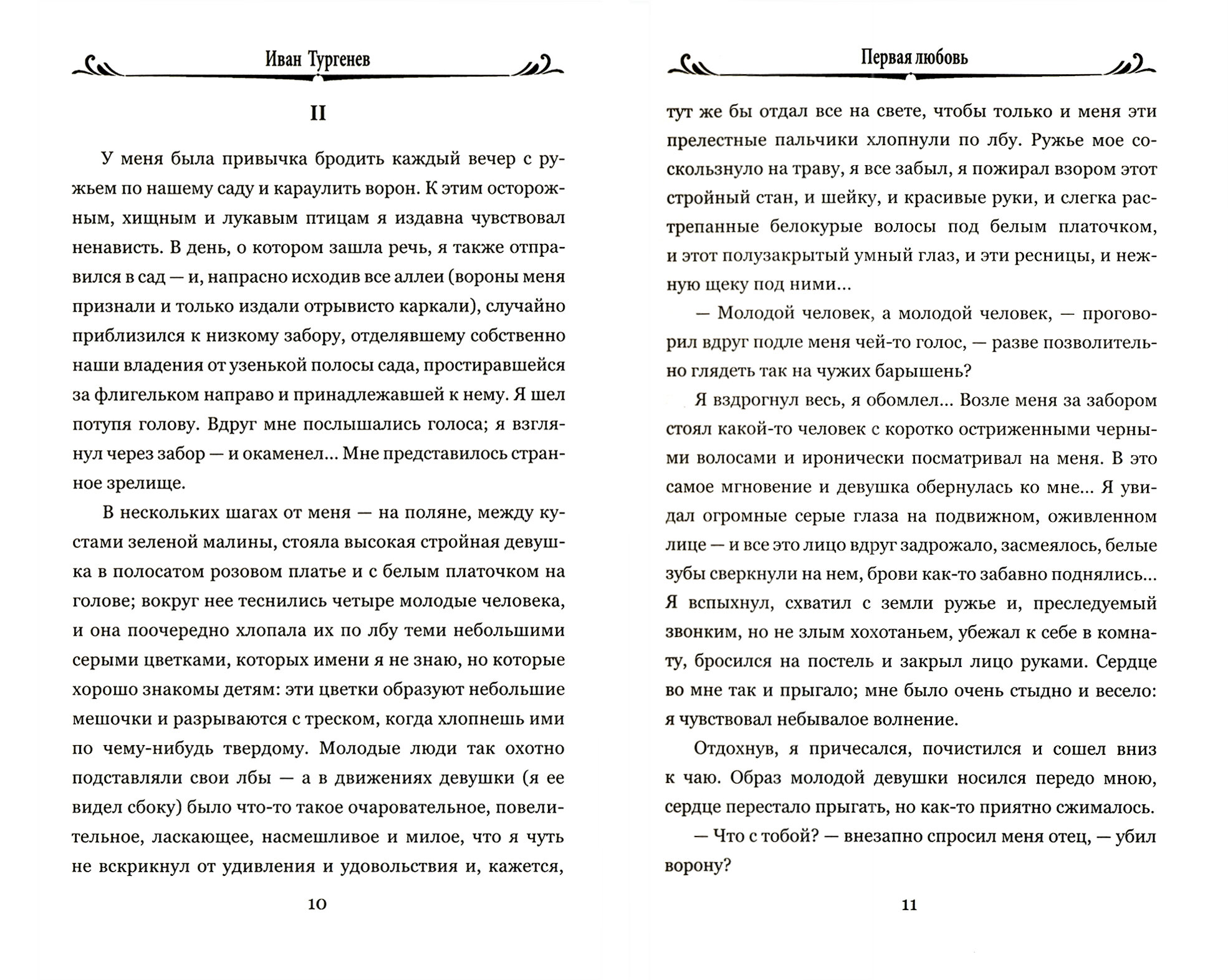 Из-под пера Тургенева готова читать все, даже заметки и тд. В том числе "Рудин", произведение, получившее разные отзывы в свое время, и "Первую любовь" - произведение скорее о любви, не затрагивающее какие-то другие темы жизни. Оно прекрасно потому, что передает дыхание молодости, ее уверенность в своей вечности, неверие в собственное старение. И все это изображено поэтически, проникновенно.