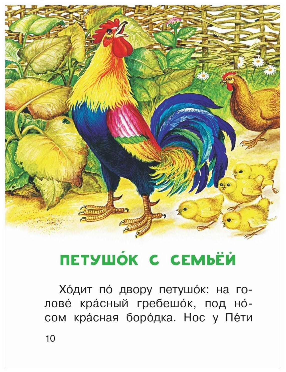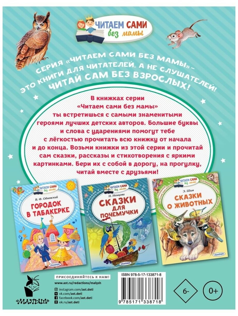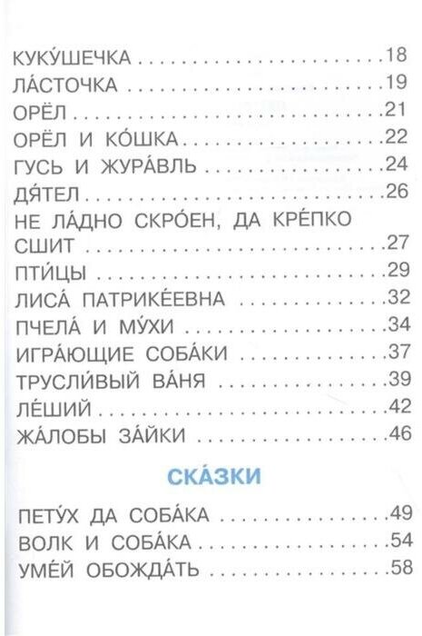 Для детей, которые начинают читать, считаю отличной книжкой. Короткие, интересные рассказы о разных животных, их повадках, характерах, взаимодействии) много рисунков, прорисованных, как впрочем во всей серии "Читаем сами, без мамы". Текст с крупным шрифтом и ударением. Ушинский отличный классик, описание живописно и художественно. Рассказы и сказки никогда не устареют. Красивый живописный живой русский язык, без оболванивания.