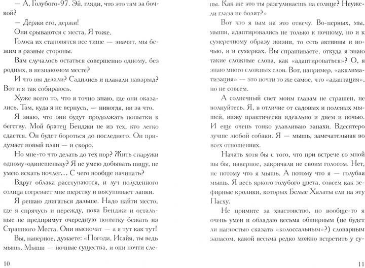 Это история о честном мышином слове. Исайя - обычный мышонок (правда он, его братья и и сестры - разноцветные), но он умеет говорить, смеяться и читать, а грустит и радуется так же, как и ты. Но на большую дружную семью Исайи обрушивается беда, и теперь мышонок должен спасти своих родных. Неожиданно на помощь ему приходит необычная девочка по имени Хейли.