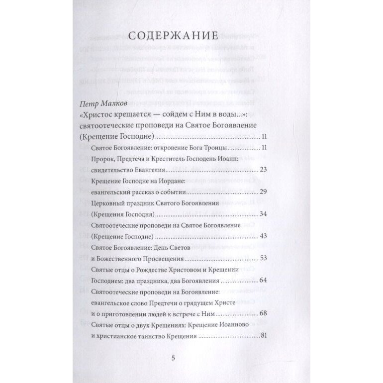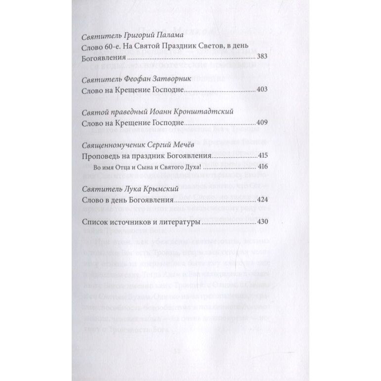 Антология святоотеческих творений на праздник Богоявления (Крещения Господня) включает произведения разных традиций и эпох, византийских, латинских и русских авторов — от святителя Василия Великого до святителя Луки Крымского. Издание предваряет вводная статья П. Ю. Малкова, призванная в ясной и доступной форме познакомить читателя с важнейшими богословскими и нравственными особенностями святоотеческого учения о духовном и нравственном значении церковного праздника.
