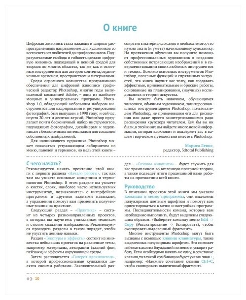 Книга отличная! Сделана на хорошей бумаге, прекрасная цветопередача. А главное, что доступно объясняет новичку, как работать в фотошопе, где что находится. что означает и как с этим работать. Так же есть конкретные уроки для лучшего усвоения материала. И еще бонусом можно скачать кисти, рисунки, с которыми работали создатели книги. Я очень довольна, что купила эту книгу!