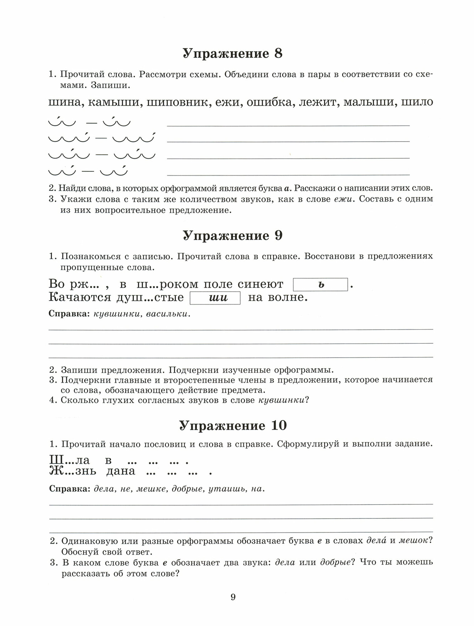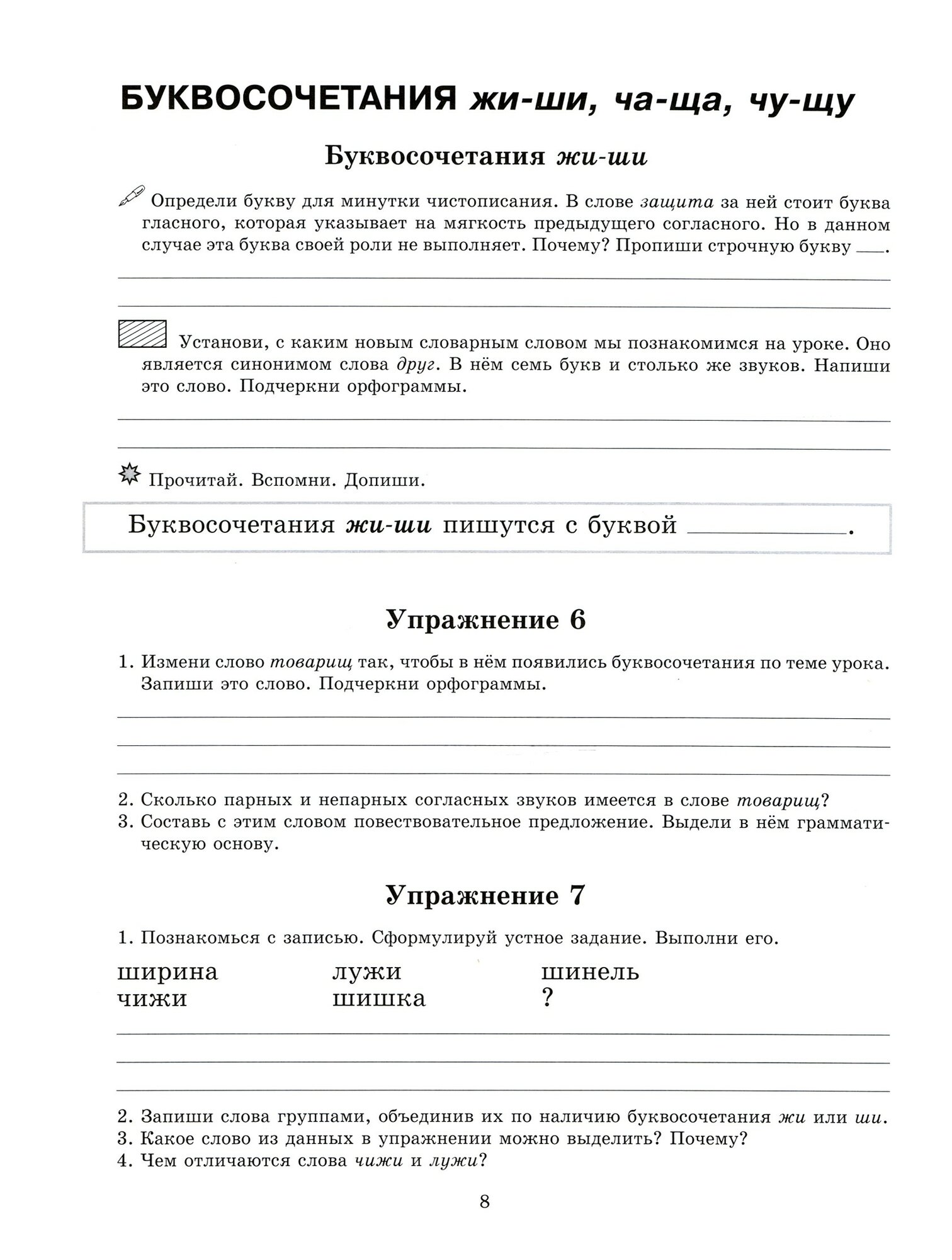 В рабочей тетради представлены упражнения для проведения занятий по чистописанию, словарной работы, по развитию знания русского языка, закрепления изучаемого языкового материала. Рабочая тетрадь состоит из 2-х частей. Во 2-ю часть включены упражнения по работе над правописанием буквосочетаний с шипящими звуками ЖИ-ШИ, ЧА-ЩА, ЧУ-ЩУ, звонкими и глухими согласными звуками, разделительным мягким знаком, частями речи. Упражнения стимулируют языковое, речевое и интеллектуальное развитие детей, развивают познавательную активность учащихся.