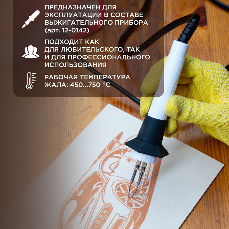Выжигатель-ручка (в сборе) предназначен для эксплуатации в составе универсальных выжигательных приборов, в том числе прибора REXANT арт. 29726906. Устройство позволяет наносить изображения на любые поверхности из дерева, пробки, кожи, ПВХ. Удобная эргономичная рукоятка выполнена из термостойкого пластика и имеет кольцо, которое убережет паяльное жало от соприкосновения с другими предметами, в том числе исключит случайные ожоги.
