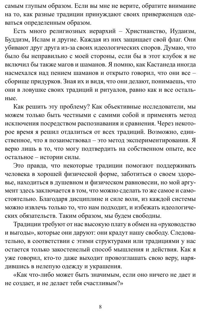 Прочитала ознакомительный фрагмент и точно теперь знаю, что куплю эту книгу. Я очарована! Даже не ожидала, что мне, которая много лет, что называется, в «теме» Кастанеды, может зайти что-то ещё, сказанное о великом мастере и о пути воина. Мне совершенно не понравились современные трактовки Кастанеды (как будто он нуждается в трактовках). Всё, что имело отношение непосредственно к Кастанеде, имеет свой «знак качества». Не знаю, как это точнее определить. Но этот знак есть у книг Флоринды Доннер, безусловно, ещё у Тайши Абеляр. Есть эта линия и в книгах Якова Бена Бирсави. И вот тут я тоже поймала эту путеводную нить, она не в словах и не в предложениях, она как бы между строк, но заставляет следовать дальше, читать и проникаться. Очень рада, что мне попалась эта книга.