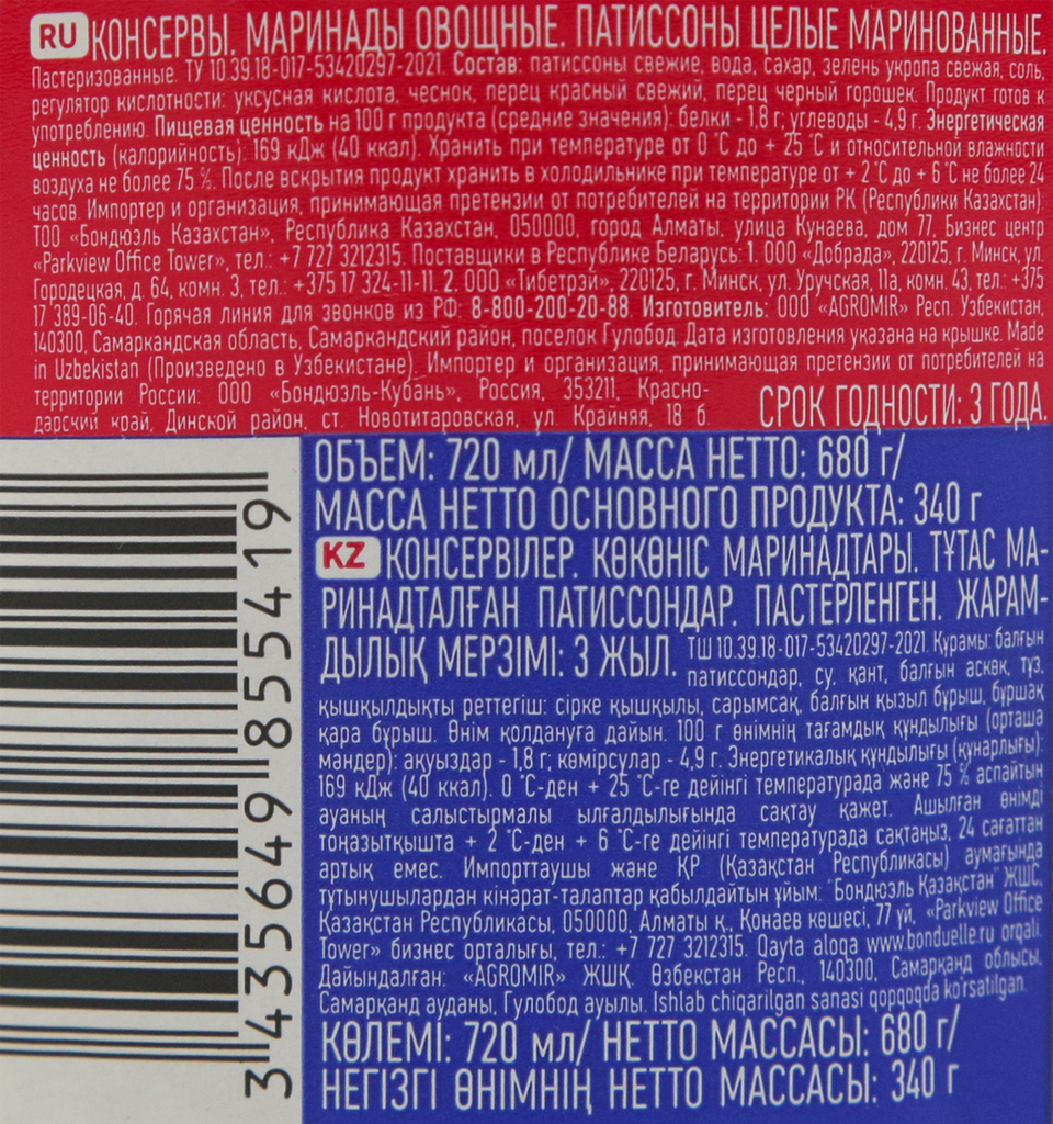 | Состав | патиссоны, вода, сахар, зелень укропа, соль поваренная пищевая, регулятор кислотности -кислота уксусная пищевая, чеснок, паприка, перец черный горошек |