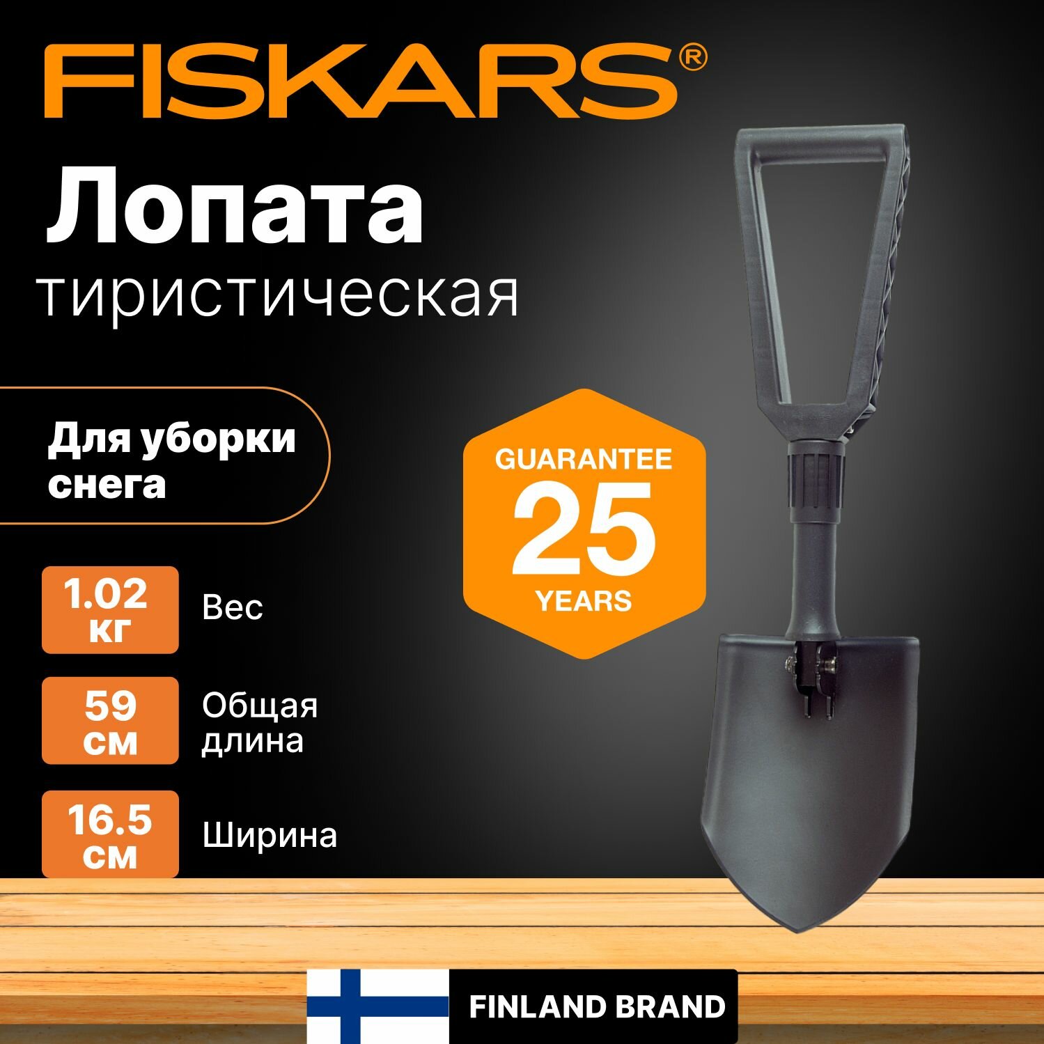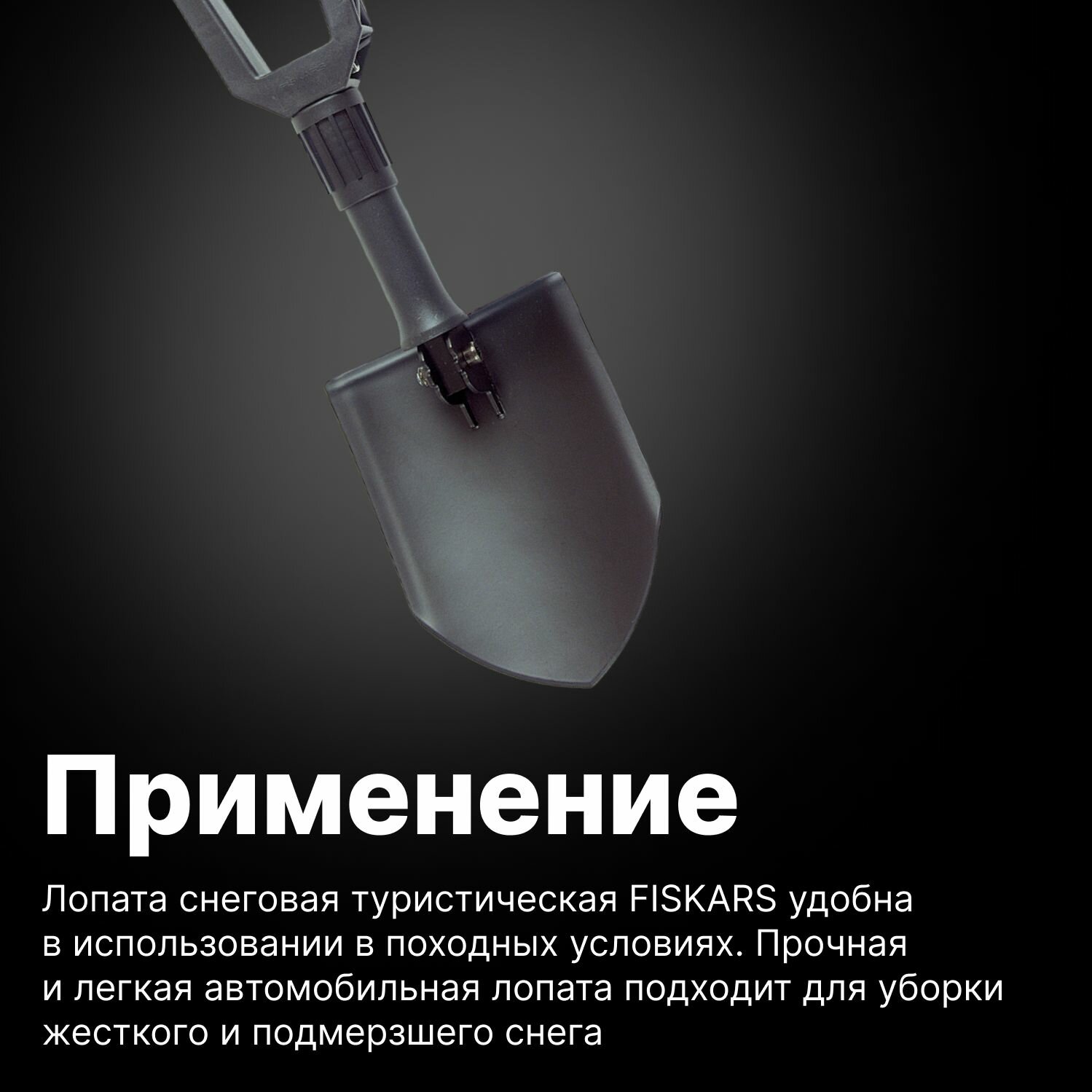 Штыковая лопата Fiskars () разработана для походных условий работы. Благодаря небольшому чехлу и складному механизму ее удобно транспортировать и перемещать. Изделие хорошо зарекомендовало себя при разных земляных работах.