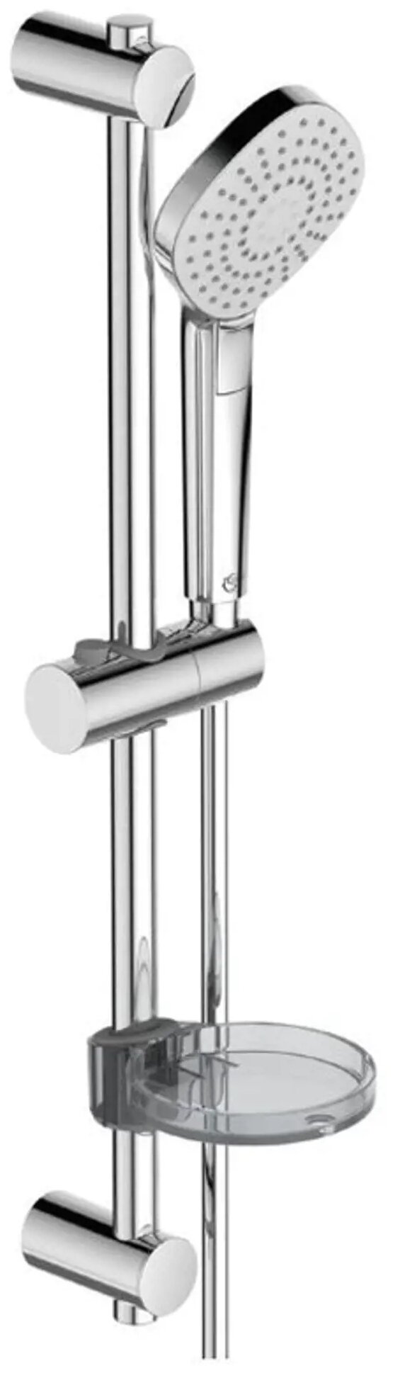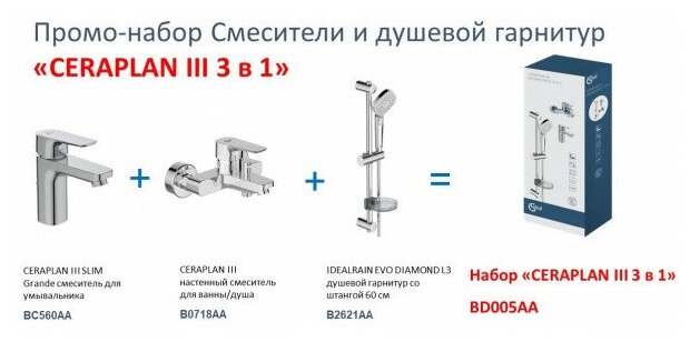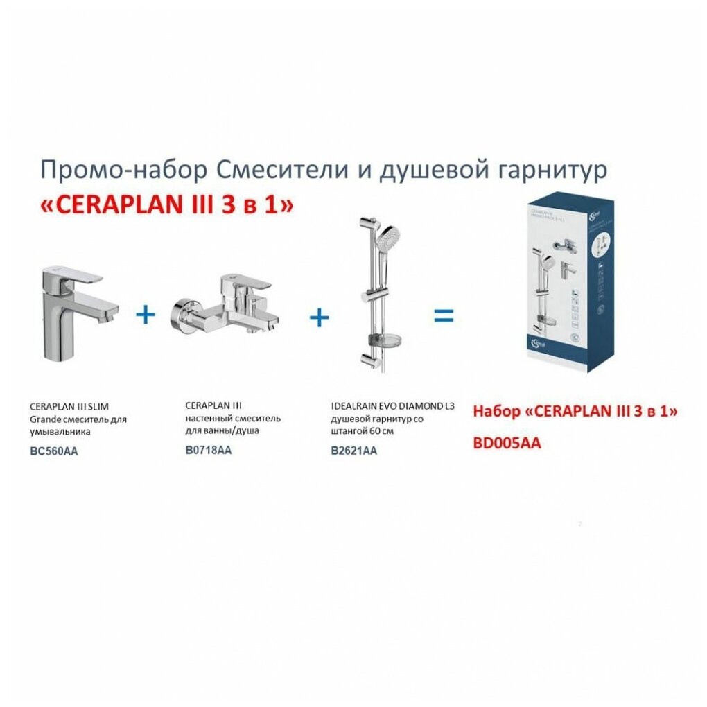 Душевой набор Ideal Standard Ceraplan III BD005AA. Промо комплект 3 в 1, состоящий из: BC560AA + B0718AA + B2621AA. Промо комплект, состоящий из: BC560AA CERAPLAN III SLIM Grande Однорычажный смеситель для раковины с металлическим донным клапаном; B0718AA CERAPLAN III Настенный смеситель для ванны/душа; B2621AA IDEALRAIN EVO DIAMOND L3 Душевой гарнитур со штангой 60 см, 3-функциональная лейка Ø110 мм, ограничитель потока воды 8 л/мин. (пластик), шланг 1750 мм с силиконовым покрытием IDEALFLEX (пластик), пластиковый держатель, мыльница в комплекте (пластик).