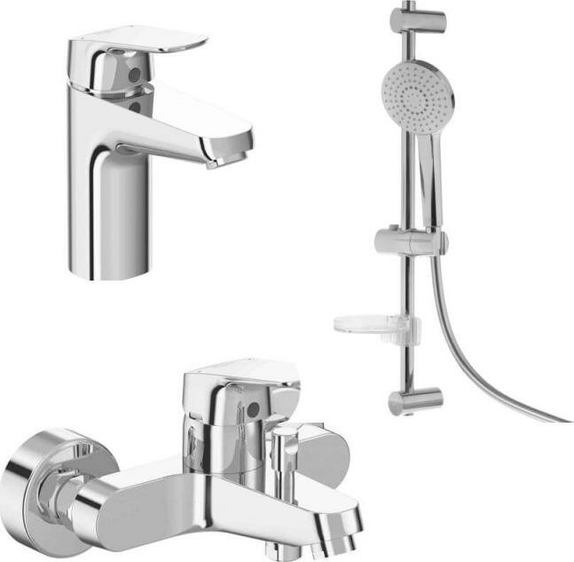 Душевой набор Ideal Standard Ceraflex BD001AA. Промо комплект 3 в 1, состоящий из: B1713AA + B1721AA + B2620AA. Промо комплект, состоящий из: B1713AA CERAFLEX Grande Однорукоятковый смеситель для умывальника; B1721AA CERAFLEX Настенный однорукоятковый смеситель для ванны/душа; B2620AA IDEALRAIN EVO ROUND L3 Душевой гарнитур со штангой 60 см, 3-функциональная лейка Ø110 мм, ограничитель потока воды 8 л/мин, шланг 1750 мм с силиконовым покрытием IDEALFLEX, пластиковый держатель, мыльница в комплекте.