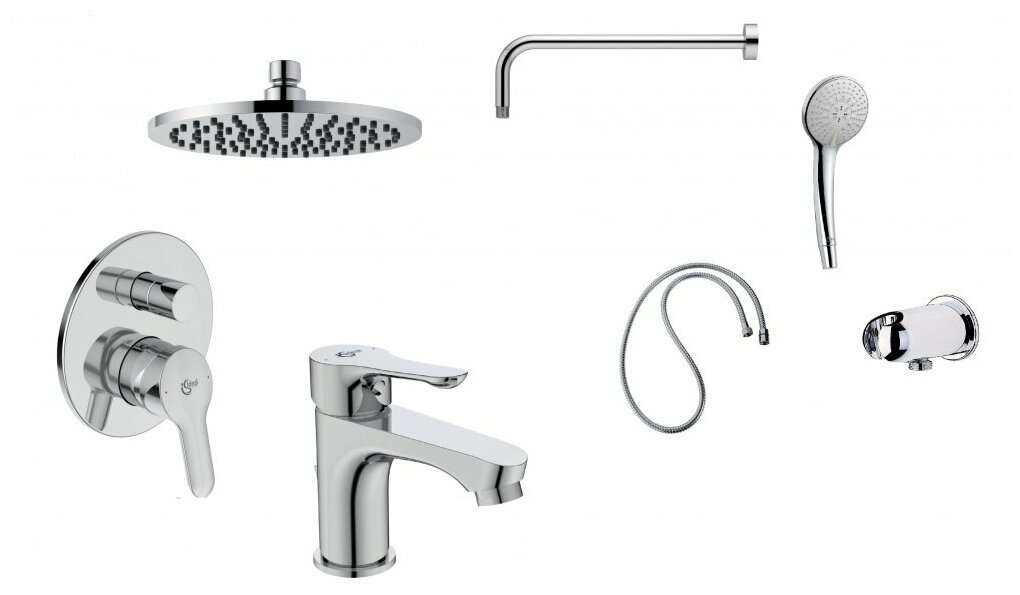 Душевой набор Ideal Standard Alpha BD003AA. Промо комплект 7 в 1, состоящий из: BC486AA + A7185AA + B9442AA + B9445AA + B940AA + B964952AA + A2406AA. BC486AA ALPHA Смеситель для умывальника. A7185AA ALPHA Встраиваемый смеситель для ванны/душа, B9445AA IDEALRAIN L1 Настенный держатель верхнего душа 400 мм, B9442AA IDEALRAIN SOFT M1 Верхний душ, B9403AA IDEALRAIN SOFT M3 Легкоочищаемая (резиновые форсунки) 3, B964952AA Шланг для душа металлический 1,5 м, A2406AA CERAWELL Подключение душевого шланга с держателем для душевой лейки, хром.