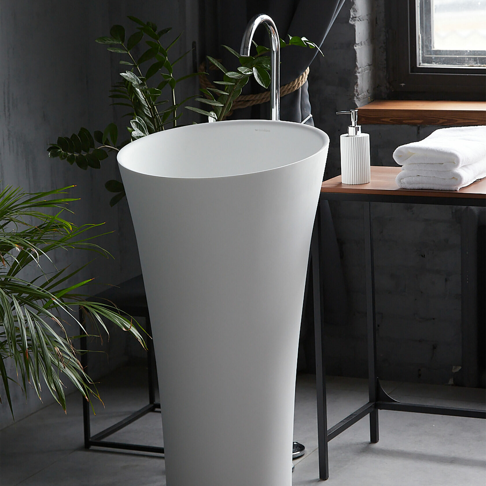 Раковина из искусственного камня для ванной комнаты. Похожие модели Montebianco Pisa и Pisa Rubinetto. Модель напольного размещения. Безусловным практическим и эстетическим преимуществом является коническая форма. Раковина занимает мало места на полу, при этом за счет расширения к верху функционально очень удобна: вода не разбрызгивается и не выплескивается из объемной, чуть наклоненной к пользователю чаши. Благодаря большой видимой площади белоснежно-матовой, бархатистой поверхности великолепно выглядит в интерьере, является самостоятельной композицией. Популярна среди владельцев частных домов с просторными, светлыми помещениями ванных комнат. Высота раковины и небольшой наклон чаши удобны как для высоких людей, так и небольшого роста, в том числе детей. Крепление смесителя либо к стене, либо напольное, на ножке, подчеркивает современный дизайн и технологичность конструкции. Материал не впитывает влагу, не порист, непроницаем для плесени, бактерий и грибков. Отличия от моделей Pisa и Pisa Rubinetto в размерах чаши (у Pisa Cono она более объемная), форме (две другие модели прямые) и месте размещения смесителя (в Pisa Rubinetto он устанавливается на поверхность раковины).