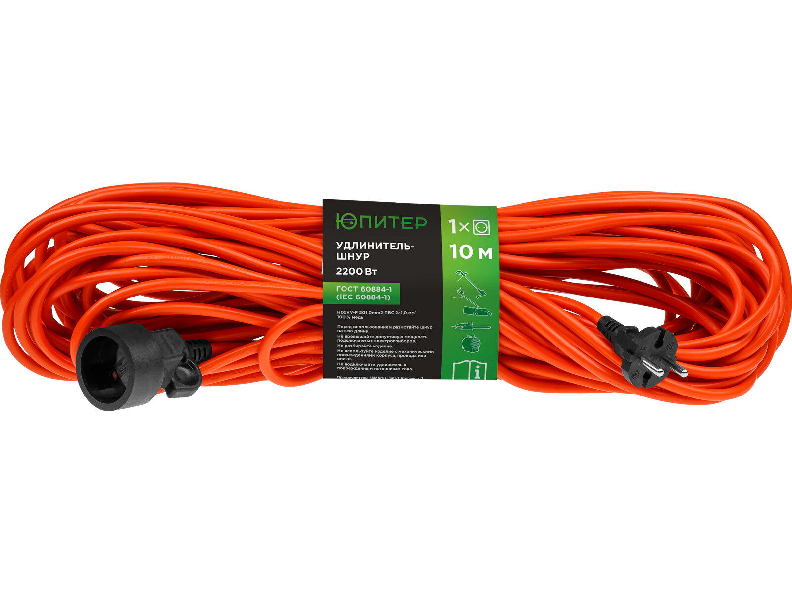 Удлинитель 10 м 1 розетка 2,2 кВт Юпитер () предназначен для использования на садовых участках, в мастерских и подсобных хозяйствах. Удлинитель на 1 розетку представляет собой ПВС-провод, с одной стороны - неразборная цельнолитая вилка, с другой - переносная розетка. Удлинитель позволяет подключить прибор мощностью не более 2200 Вт. Данный удлинитель 10 м имеет степень защиты IP20, противостоит повышенной влажности и перепаду температур. Розетка удлинителя имеет защитные шторки, которые открываются нажатием только на две одновременно, что обеспечивает надежную защиту от случайного прикосновения к токоведущим частям (защита детей).
