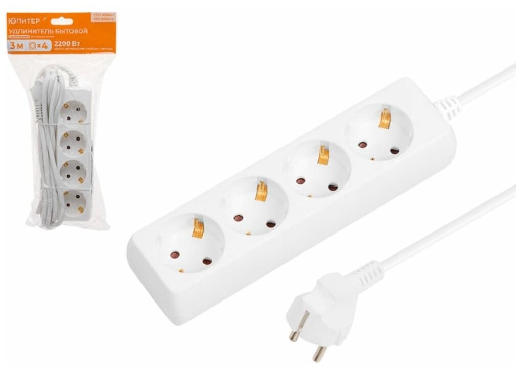 Удлинитель 3 м 4 розетки 2,2 кВт с заземлением юпитер () оснащен латунной контактной группой для устойчивого электрического контакта между вилкой и розеткой. Защитные шторки открываются нажатием только на две одновременно, что обеспечивает надежную защиту от случайного прикосновения к токоведущим частям (защита детей). Провод из чистой меди и контроль производства гарантируют реальное сечение провода и работоспособность удлинителя при подключении нагрузки до 2200Вт. Присоединение проводов выполнено методом точечной сварки, в отличие от присоединения проводов винтовыми зажимами, благодаря чему исключается возможность ослабления контактов в течение всего срока службы удлинителя. Изготовлен только из качественных материалов в соответствии с ГОСТ60884-1 и предназначен для подключения бытовых электрических приборов к электрической сети переменного тока внутри помещения.