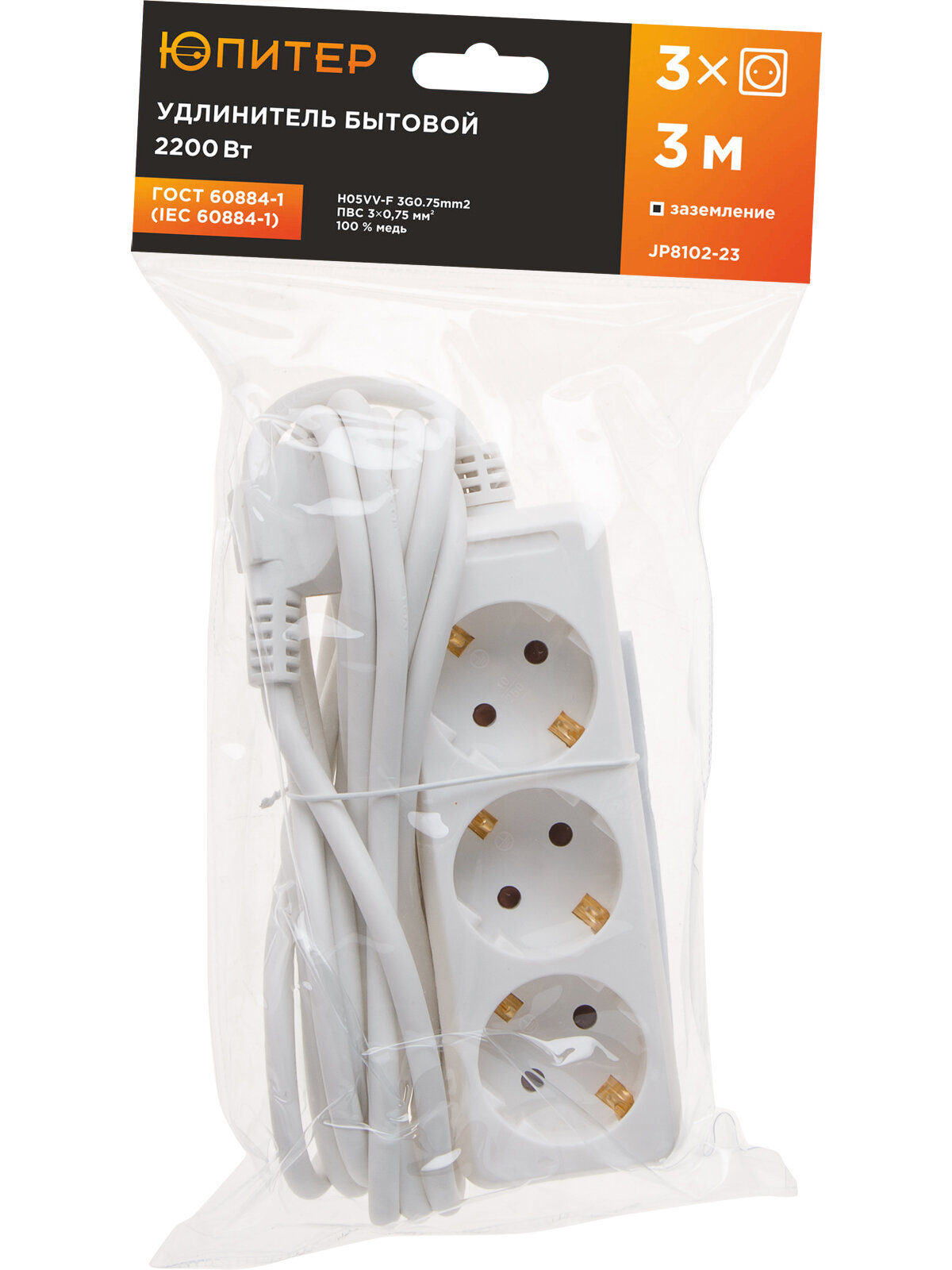 Удлинитель 3 розетки с заземлением 3 м 2,2 кВт ЮПИТЕР () оснащен латунной контактной группой для устойчивого электрического контакта между вилкой и розеткой. Удлинитель на 3 розетки оснащен защитными шторками, которые открываются нажатием только на две одновременно, что обеспечивает надежную защиту от случайного прикосновения к токоведущим частям (защита детей). Провод из чистой меди и контроль производства гарантируют реальное сечение провода и работоспособность удлинителя 3 гнезда при подключении нагрузки до 2200Вт. Присоединение проводов выполнено методом точечной сварки, в отличие от присоединения проводов винтовыми зажимами, благодаря чему исключается возможность ослабления контактов в течение всего срока службы удлинителя. Удлинитель 3 м изготовлен только из качественных материалов в соответствии с ГОСТ60884-1 и предназначен для подключения бытовых электрических приборов к электрической сети переменного тока внутри помещения.
