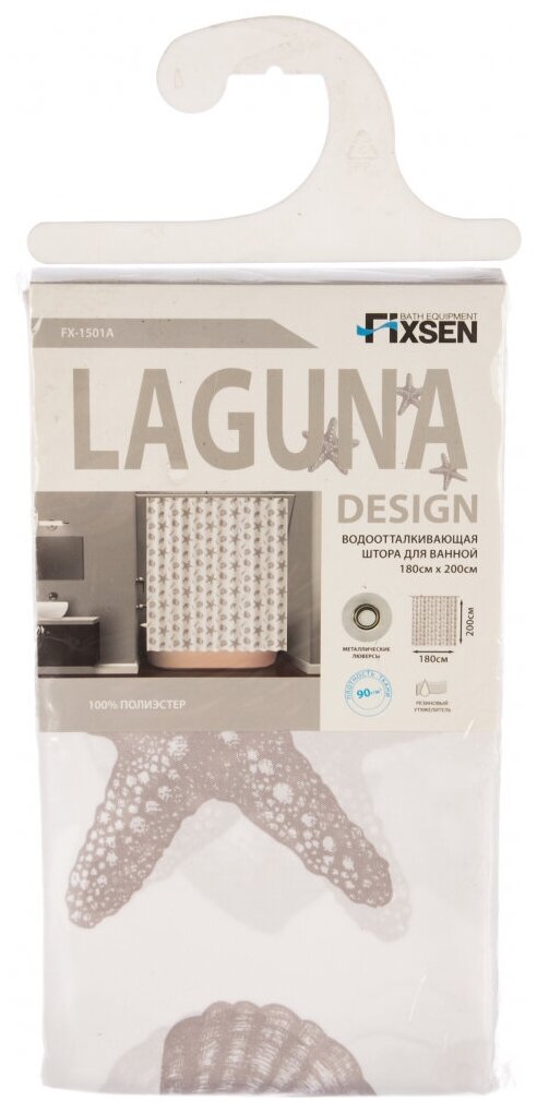 Штора Laguna FX-1501A изготовлена из практичного износостойкого полиэстера плотностью 90 г/м². Ткань белая с морским рисунком: модель будет хорошо смотреться в современном интерьере и станет одним из украшений ванной комнаты. Размер полотна — 180 × 200 см (ширина × длина): можно полностью закрыть боковую сторону ванны, обеспечив приватность во время купания и защитив пространство за бортиками от брызг.