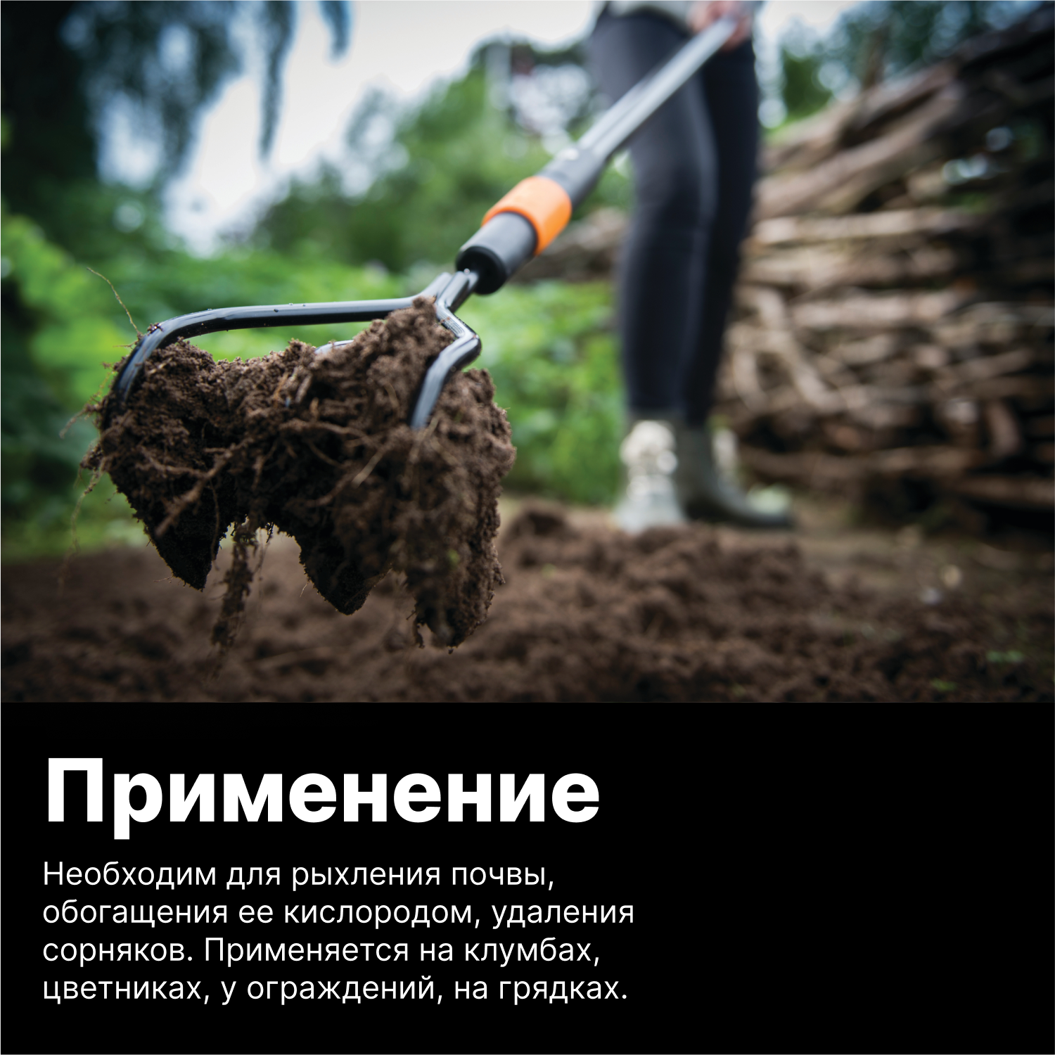 Стоит также отметить, что зубцы качественно наточены на производстве, но при необходимости их можно легко заточить при помощи специального инструмента. Культиватор Fiskars QuikFit благодаря компактной форме практично использовать для рыхления почвы в междурядьях, труднодоступных местах, а также маленьких или узких поверхностях.