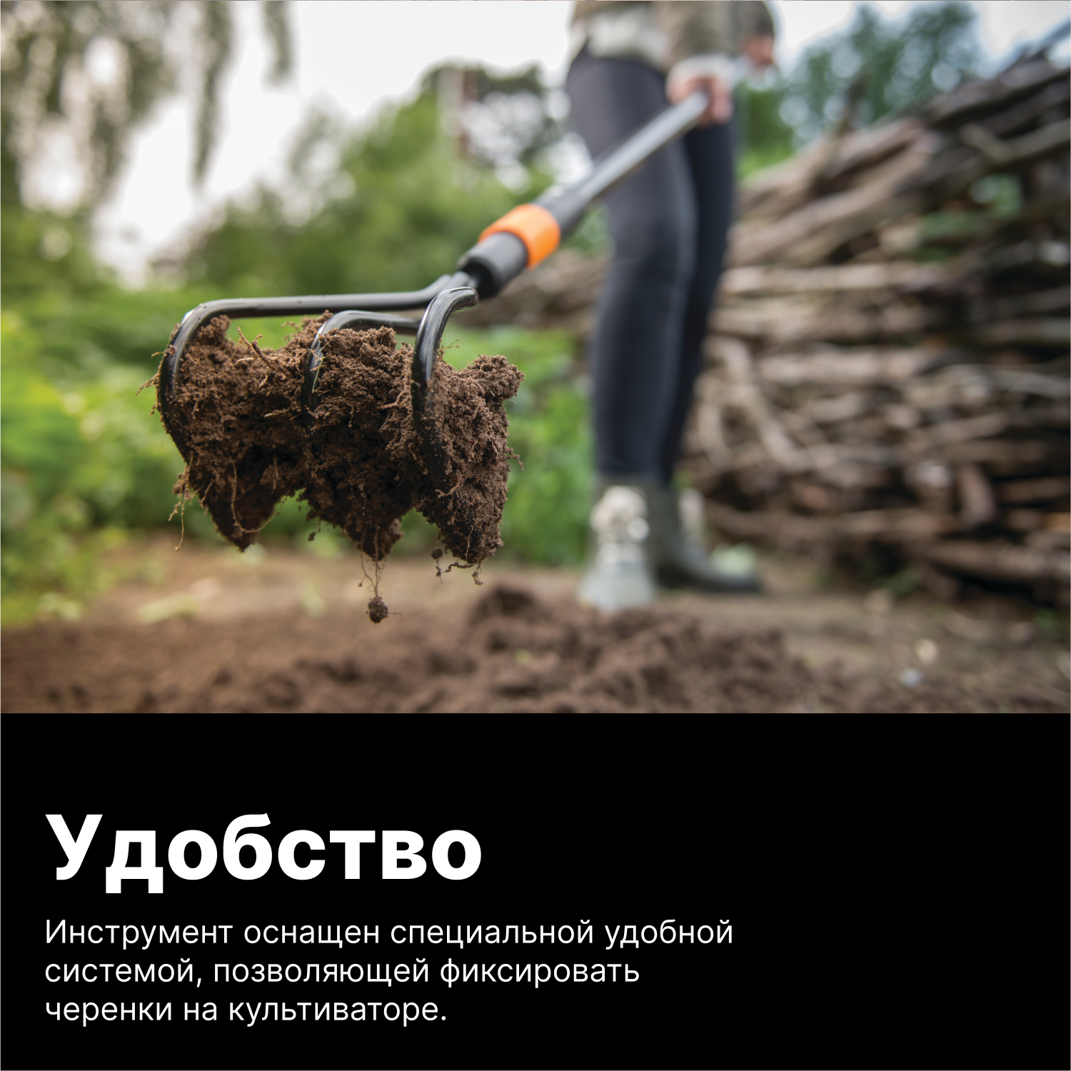 Серия QuikFit, как и сама насадка культиватор, обладает несколькими неоспоримыми качествами. Во-первых, для хранения и транспортировки необходимо совсем немного места. Во-вторых, компактная конструкция культиватора занимает совсем немного места при хранении. В-третьих, инструмент невероятно практичен, удобен и функционален в использовании. К тому же, насадка культиватор отлично подходит для крепления на все рукоятки из данной линейки.