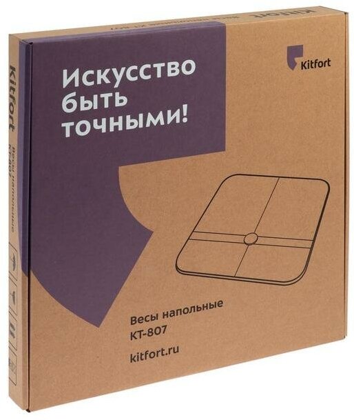 | Прочие особенности и свойства | Умные весы!,Модель КТ-807 представляет поколение умных весов. Они обеспечивают высокую точность измерения и станут неизменным спутником для людей, следящих за весом.,,Управление со смартфона,Внутри весов встроены датчики, встав на которые проводится диагностика тела. Далее весы легко синхронизируются с приложением «Fitdays» по Bluetooth, где будут отражены показатели вашего тела. Вся информация будет храниться у вас в телефоне.,,15 параметров за 5 секунд!,В течение 5 секунд после взвешивания, в приложении отразятся важнейшие параметры вашего тела. Среди них:вес, возраст тела, содержание воды, белка, жира и костной массы в вашем организме, общий баланс вашего тела и многие другие.,,Удобное взвешивание с детьми,Чтобы узнать вес ребёнка, активируйте режим «Baby Mode», предварительно встав на весы без него, а затем вместе. Весы сами рассчитают вес ребёнка и запомнят его. Весы запоминают информацию по каждому пользователю, всего можно добавить до 24 человек.,,На весы с удовольствием!,Весы оснащены жидкокристаллическим дисплеем с крупными цифрами, что делает их использование максимально удобным.,,Стильный дизайн,Весы выполнены из закалённого стекла, которое лишь на первый взгляд кажется хрупким:на самом деле оно выдерживает массу до 180 кг. Весы имеют стильный и привлекательный дизайн, благодаря чему впишутся в любой интерьер.,,Противоскользящие ножки,Прорезиненные ножки обеспечивают весам дополнительную устойчивость и предотвращают их скольжение по полу, что гарантирует безопасность во время взвешивания.,,Экономны в потреблении,На обратной стороне устройства находится разъём для батареек. Низкое энергопотребление обеспечивает бесперебойную работу устройства от одного комплекта из четырёх батареек AAA. Включение и выключение весов происходит автоматически. |