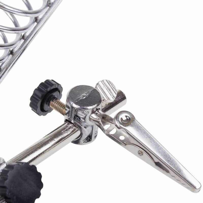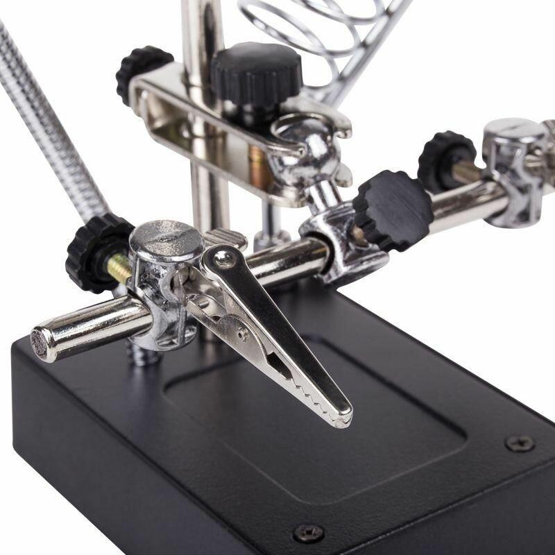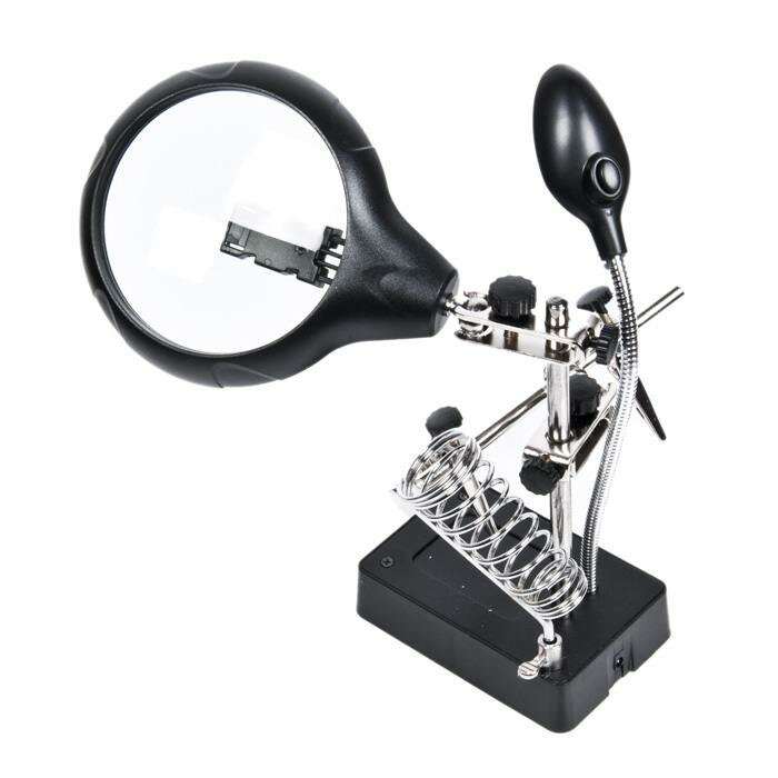 | Комплект поставки | Чугунное основание, шарнирное соединение с зажимами типа "крокодил", две лупы с 2.5 и 7.5 кратным увеличением, подставка под паяльник и LED подсветка |