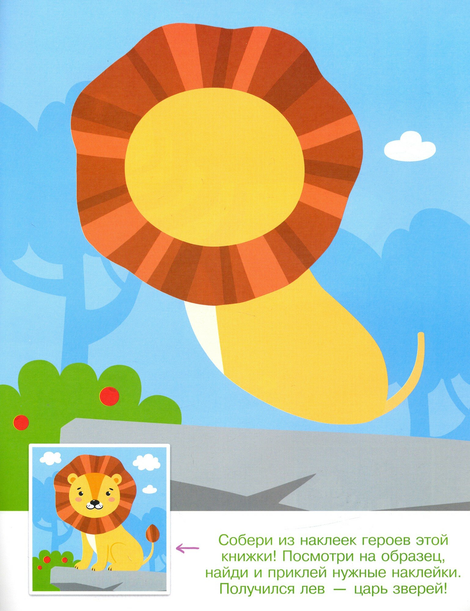Книжка с увлекательными и развивающими заданиями. Именно конструктор. Ребенку нужно внимательно рассмотреть страницу и картинку с животным в нижней ее части. После этого из большого количества наклеек выбрать те, которые помогут сложить точно такой же рисунок. Но на этом задание не закончено. Наклейки нужно точно и правильно приклеить, чтобы получился определенный зверь.