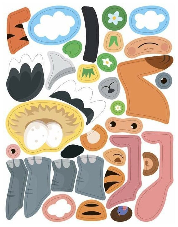 Необходимо дополнить картинку-заготовку наклейками по образцу внизу страницы. Прекрасно запоминаются названия частей тела животных, названия этих животных, также отличная возможность повторить названия цветов. Ребенку нужно проявить навыки в сравнении предметов, их верном (иногда симметрином) расположении на странице. Сравнение с картинкой-образцом позволяет оценить проделанную работу.