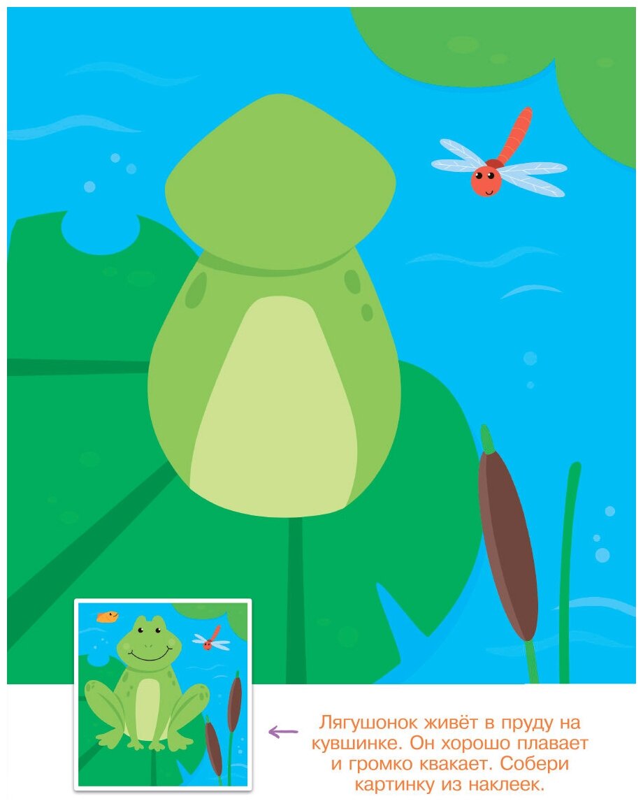 Наклеек два разворота. Они красочные и разных размеров. Не помечены номером страниц, что тоже заставляет ребенка сосредоточиться.