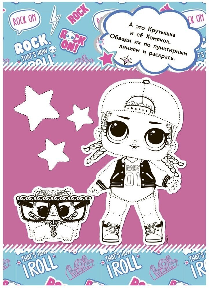 Стильная раскраска с картонной куклой L.O.L. Surprise, разворотом ярких наклеек, увлекательными заданиями, красочными иллюстрациями, головоломками и лабиринтами – лучший подарок для девочки! Большая картонная куколка Лол (высота 20,5 см) - стильная, яркая - устанавливается на компактные подставки. Волосы и одежду куклы lol surprise украшает глиттер: блестки переливаются на свету, это делает куклу ещё красивее и очаровательнее. Куколки L.O.L. идеально подходят для игры и коллекционирования, ведь в серии представлено 8 различных книг: каждая из которых – это новые игровые задания, новые наклейки и новая картонная куколка Лол! Раскраска с развивающими заданиями приведет в восторг девочку, которой нравятся куклы лол (lol surprise) – всегда такие разные и необыкновенно привлекательные. Книга с заданиями L.O.L. Surprise (lol surprise) – готовый подарок на Новый год девочке от 3 лет. Развивающая книга с картонной куколкой L.O.L. Surprise из серии «L.O.L. Surprise! Раскраска с наклейками и большой куклой» изготовлена по официальной лицензии MGA.
