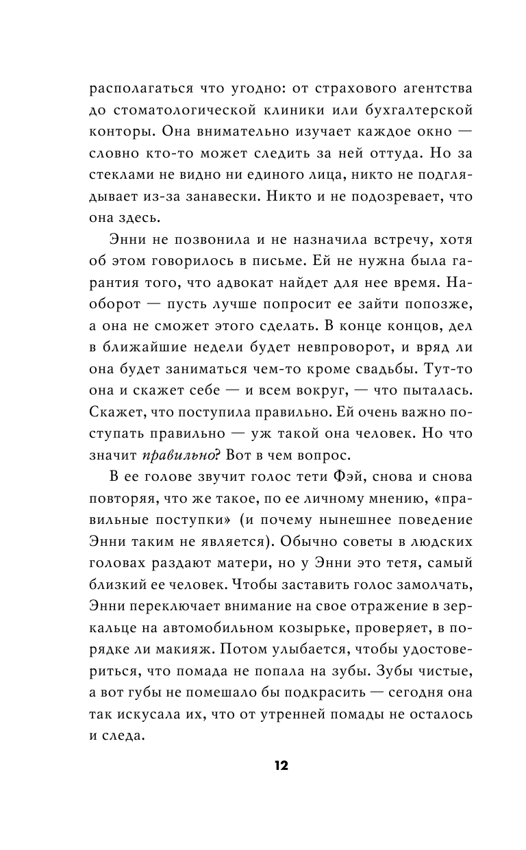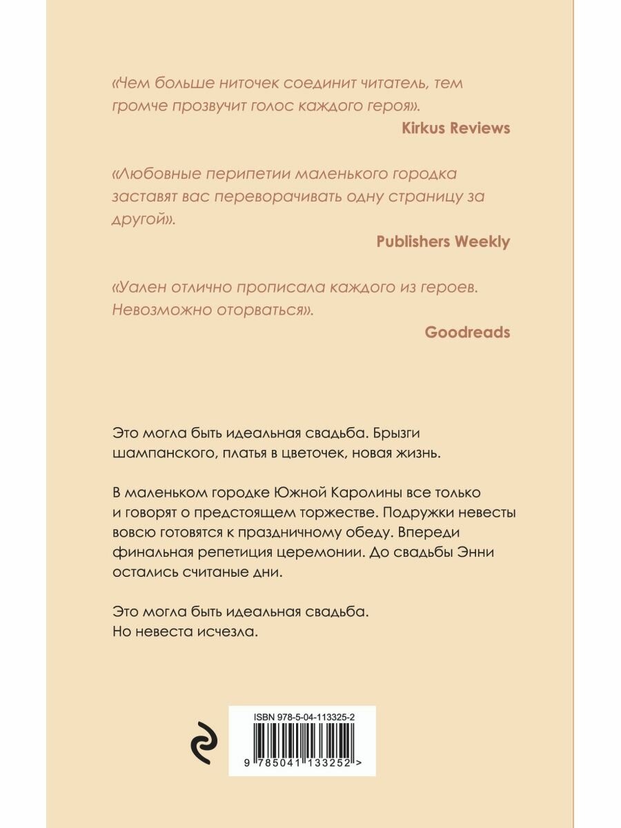 Отличная камерная история. Обожаю сюжеты, где все действие разворачивается в пределах одной семьи или одного маленького городка. Это всегда придает некий шарм повествованию. В этом романе мне очень понравился сюжет с пропавшей невестой: как, зачем, почему? Все это очень интересно распутывать. Мне показалось, что это отличный образец качественной современной литературы, потому что и персонажи хорошо прописаны, и мир вокруг также не подвисает в плане сюжета – здесь все работает. И нет оборванных сюжетных линий, так что минусов с этом романе я найти смогла. Прочитайте! Вечер вы точно хорошо проведете