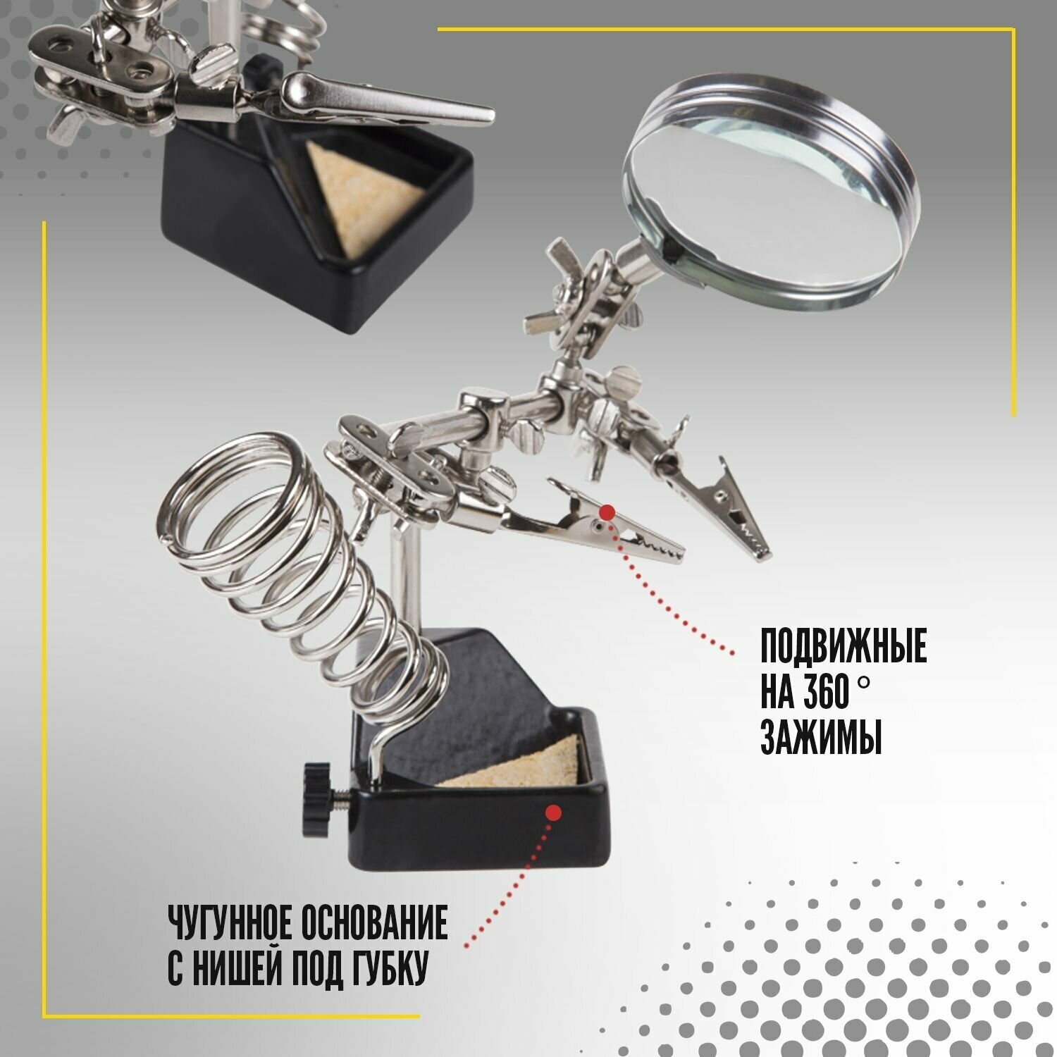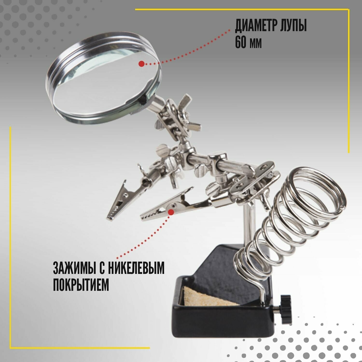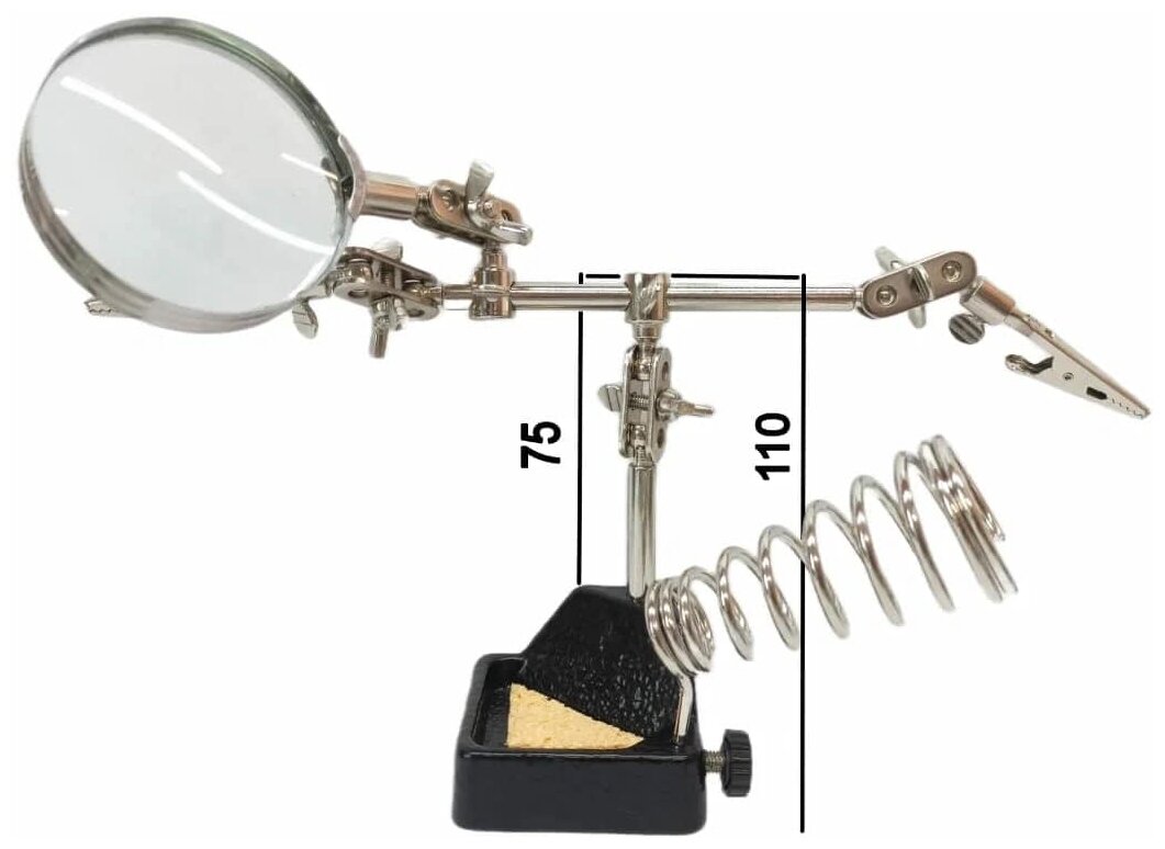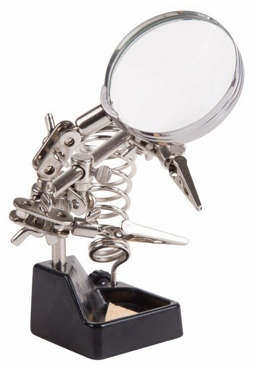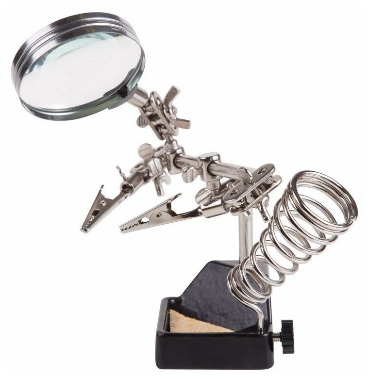 Третья рука идеальный помощник, при работе с мелкими деталями,когда не хватает двух рук. Модель с 2.5-кратным увеличением (возможность регулировки положения, диаметр линзы 60 мм). С помощью лупы можно будет рассмотреть даже самые мелкие детали.