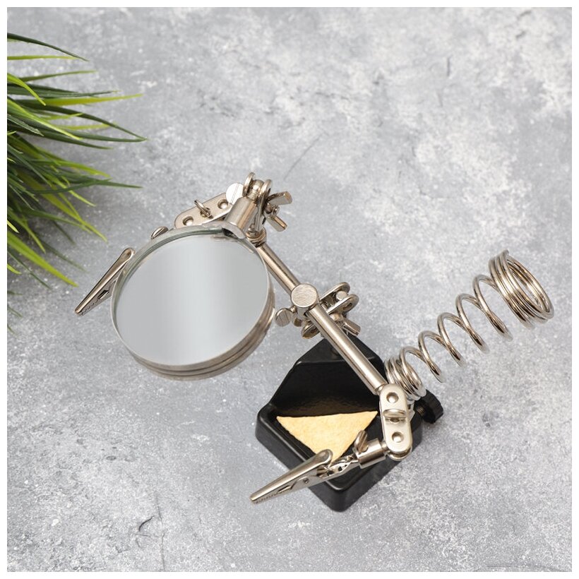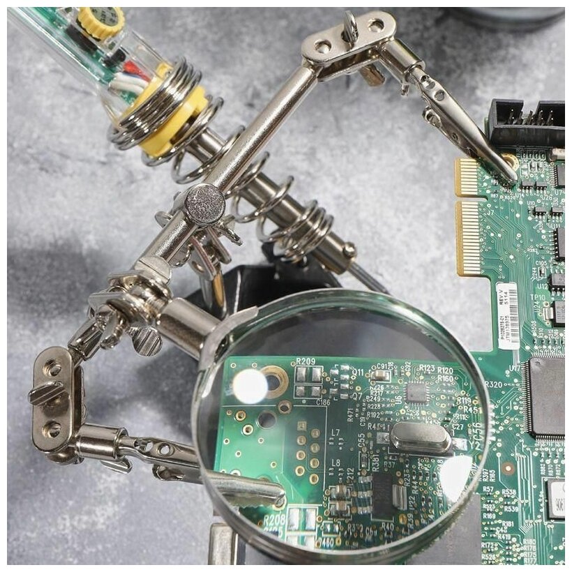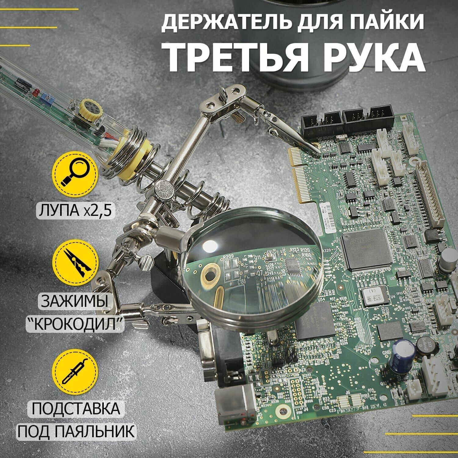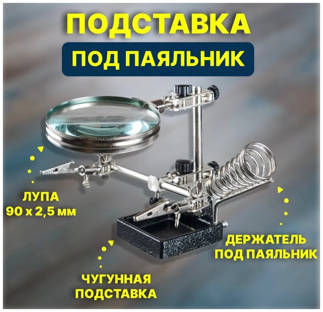 Третья рука идеальный помощник, при работе с мелкими деталями,когда не хватает двух рук. Модель с 2.5-кратным увеличением (возможность регулировки положения, диаметр линзы 60 мм). С помощью лупы можно будет рассмотреть даже самые мелкие детали.