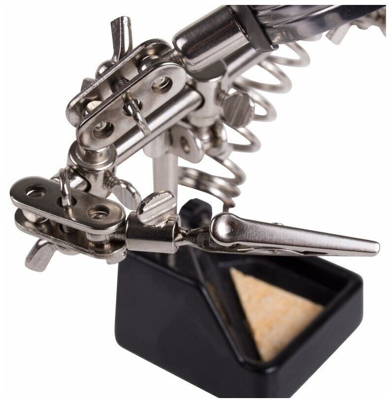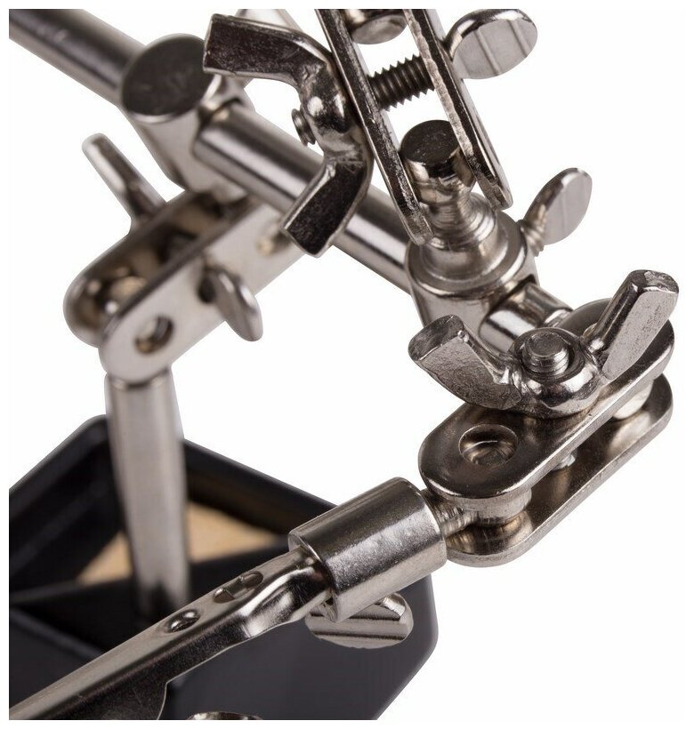| Применение продукта | Держатель «третья рука» с лупой х2.5 REXANT служит главным образом при проведении паяльно-сборочных работ в электронике, ювелирном деле, сборке и ремонте для зажима мелких деталей в любом нужном положении, когда не хватает двух рук. Инструмент состоит из чугунного основания (тяжелая подставка с нишей для губки, мелких деталей или припоя), шарнирного соединения с зажимами типа «крокодил» (подвижных во всех плоскостях) с никелевым покрытием, лупы с 2.5-кратным увеличением (возможность регулировки положения, диаметр линзы 60 мм) и спиралевидной подставки под паяльник. С помощью лупы можно будет рассмотреть даже самые мелкие детали. |