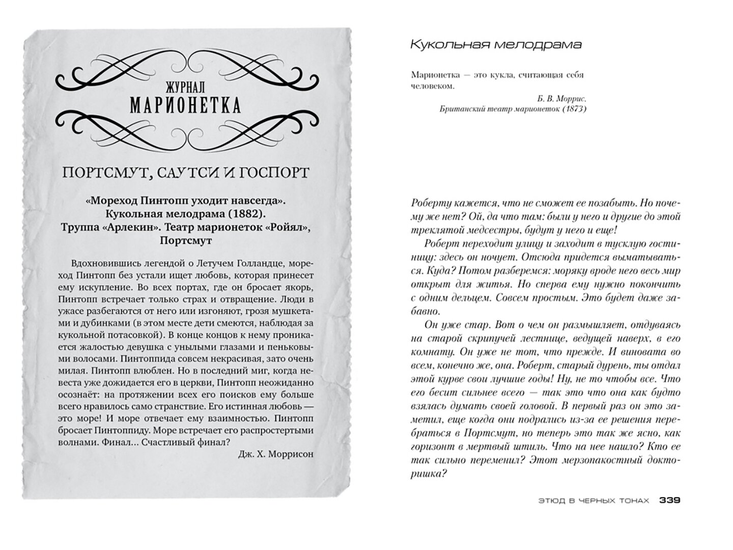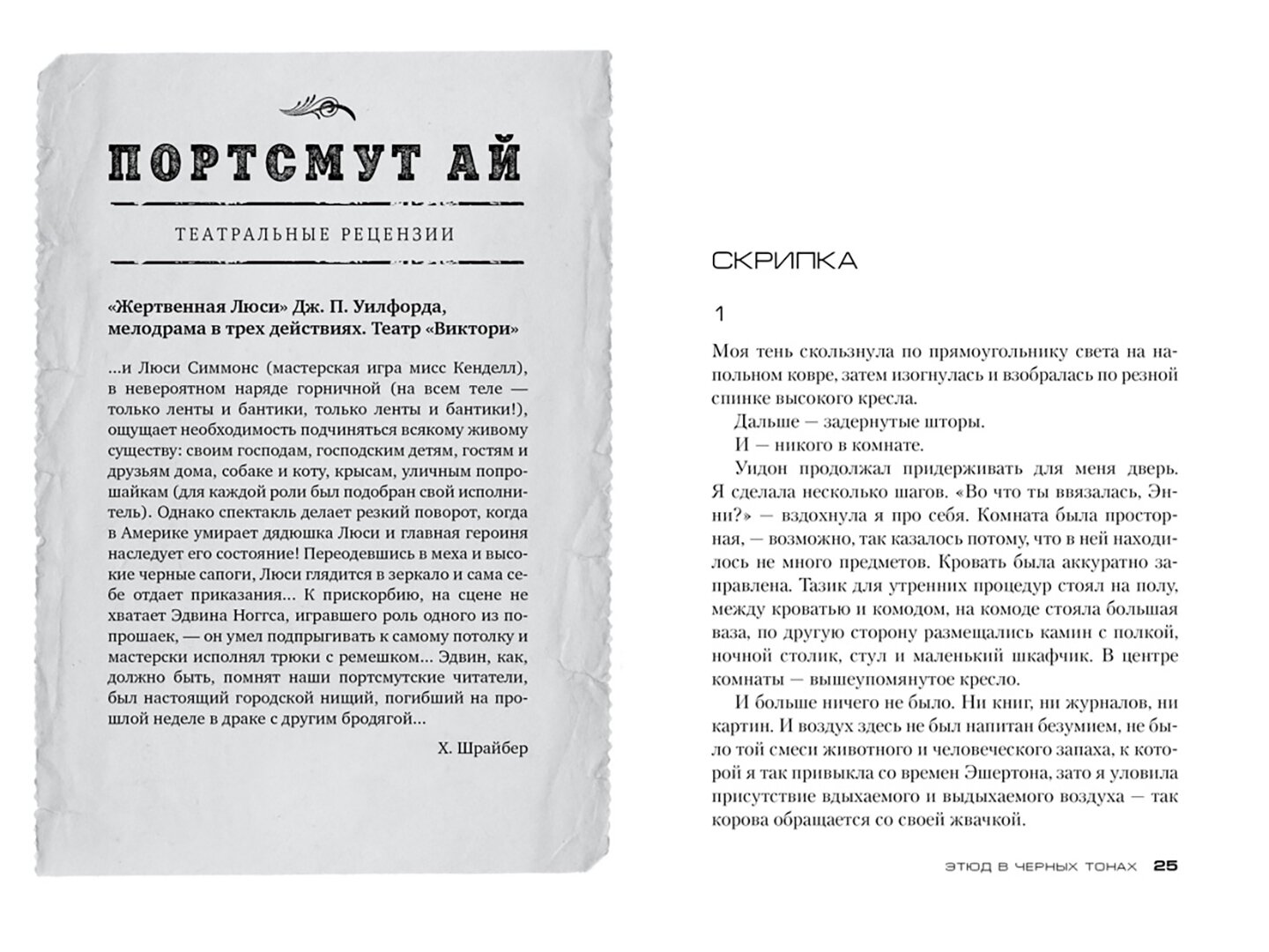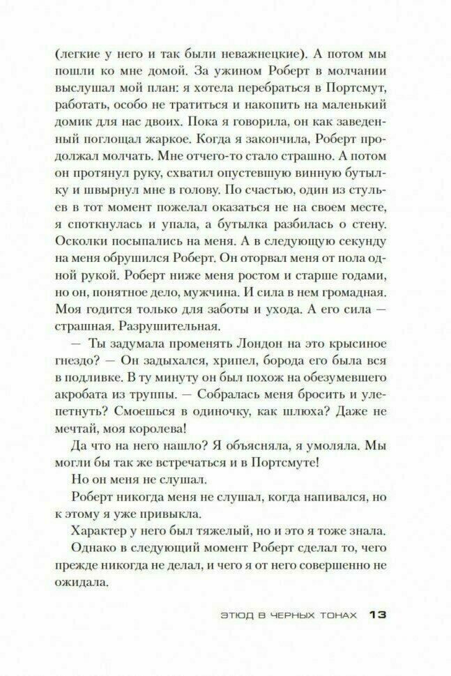 В "Этюде в черных тонах" автор рассказывает свою версию появления у Артура Конан Дойла такого литературного персонажа как Шерлок Холмс, с его дедуктивным методом, игрой на скрипке, использованием уличных мальчишек в качестве соглядатаев. Что касаемо непосредственно детективной истории, то она безупречна. Догадаться КТО - невозможно, но вот КАК - для тех, кто читал "Соблазн" - реально (скажу честно, хоть и читала, но соотнести раздражавшее порой большое количество театральных афиш и рецензий с филиями и наживками из "Соблазна" ума, увы!, не хватило). Что касается финала, то это просто бомба! -
