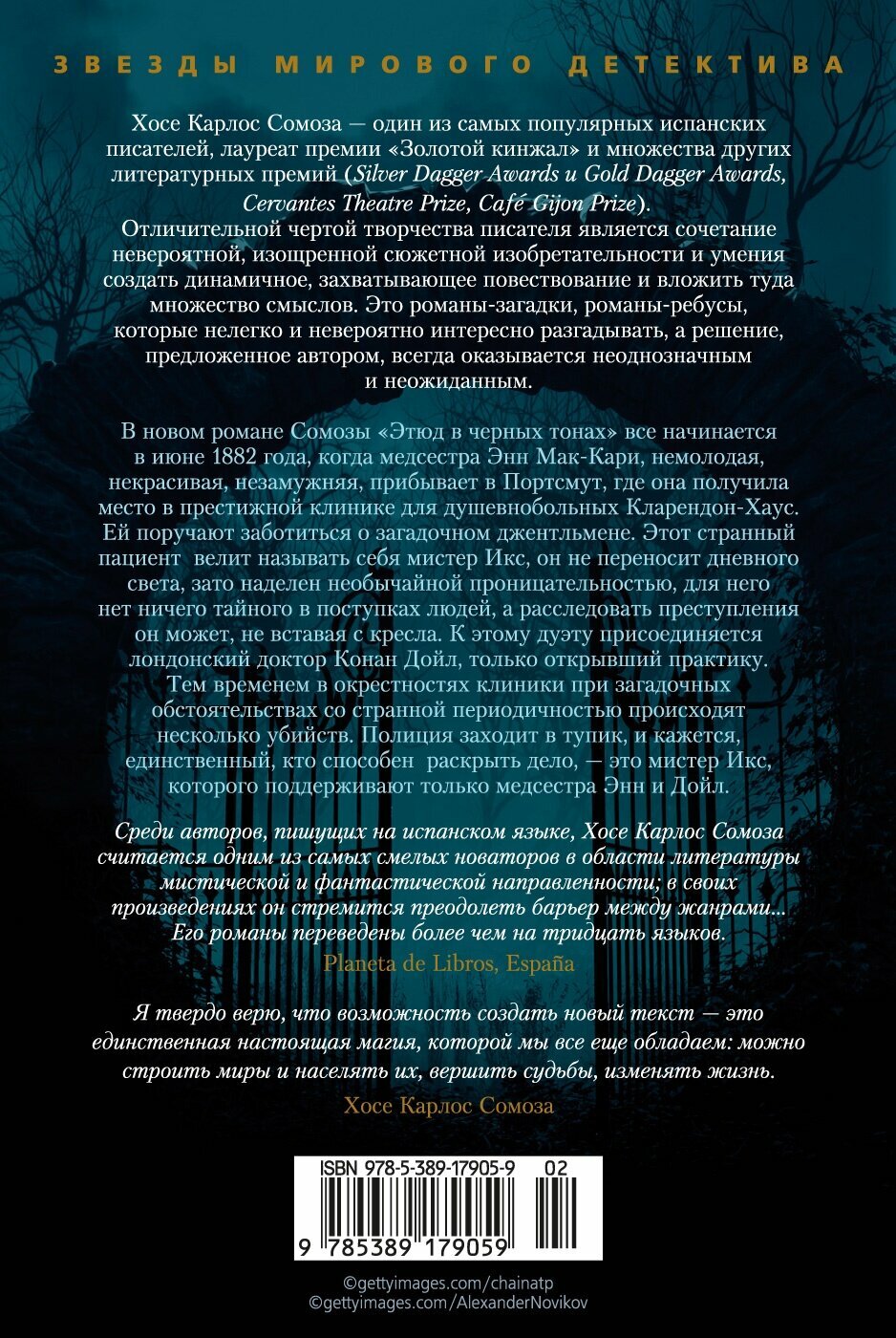 Хосе Карлос Сомоза - один из самых популярных испанских писателей, лауреат премии «Золотой кинжал» и множества других литературных премий (Silver Dagger Awards и Gold Dagger Awards, Nadal Prize, Cervantes Theatre Prize, Cafe Gijon Prize). В новом романе Сомозы «Этюд в черных тонах» все начинается в июне 1882 года, когда медсестра, Энн Мак-Кари, немолодая, некрасивая, незамужняя, прибывает в Портсмут, где она получила место в престижной клинике для душевнобольных Кларендон-Хаус. Ей поручают заботиться о загадочном джентльмене. Этот странный пациент велит называть себя мистер Икс, он не переносит дневного света, зато наделен необычайной проницательностью, для него нет ничего тайного в поступках людей, а расследовать преступления он может, не вставая с кресла. К этому дуэту присоединяется лондонский доктор Конан Дойл, только открывший практику. Тем временем в окрестностях клиники при загадочных обстоятельствах со странной периодичностью происходят несколько убийств. Полиция заходит в тупик, и кажется, единственный, кто способен раскрыть дело, - это мистер Икс, которого поддерживают только медсестра Энн и Дойл.