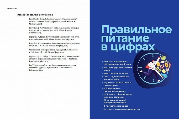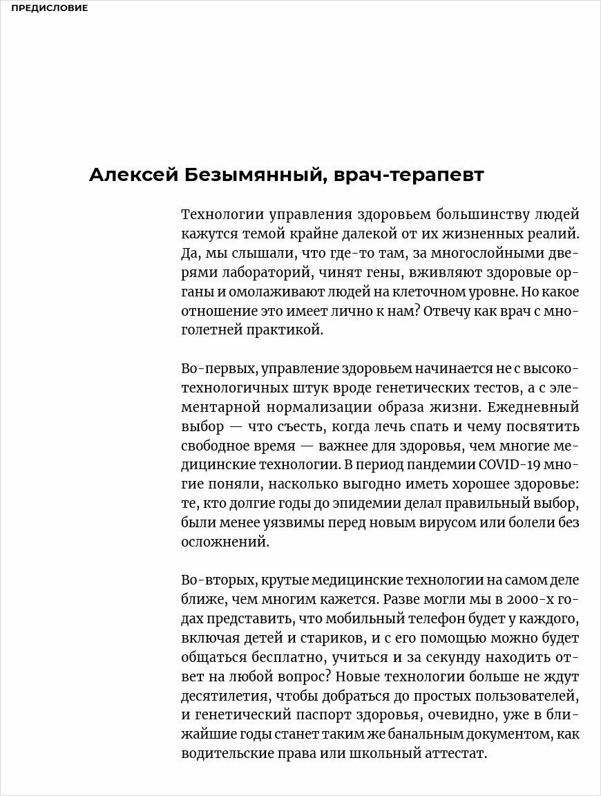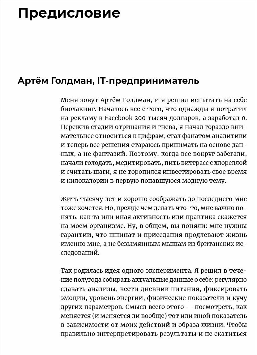 «Нам повезло родиться в мире, где технологий и знаний достаточно, чтобы обеспечить человеку не просто долгую, а полноценную до последней минуты жизнь — без критичных возрастных проблем, с высоким уровнем комфорта. Но есть и плохая новость. Волшебной таблетки или инъекции вечной молодости и здравого ума нет и не предвидится. Единственный способ станцевать на свадьбе своих праправнуков и сделать при этом селфи сто двадцатым айфоном — уже сегодня перестать валять дурака и заняться будущим. Работа предстоит серьезная. Вам предстоит изучить, как именно устроена выданная вам модель человека: несмотря на внешнюю однотипность, индивидуальные особенности есть у каждого. Затем — настроить собственный организм на оптимальный режим. После — совершенствовать работу мозга, искать пути быть продуктивнее в важных для вас областях. С точки зрения официальной медицины это и называется биохакинг».